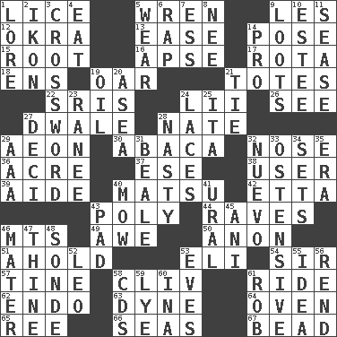 ACROSS 1. Louse (plural) 5. Songbird 9. French article 12. Gumbo ingredient 13. Comfort 14. Introduce or present, as a question 15. Carrot, for example 16. Domed church section 17. Round or rotation of duties 18. Followers of ems 19. Rowing implement 21. Hauls 22. Indian titles of respect 24. Cards in a Roman deck? 26. Observe 27. A sleeping potion; an opiate (poet.) 28. Nathan's nickname 29. A really long time 30. Phillipine bananalike plant 32. Characteristic smell of wine 36. Land measure 37. Compass dir. 38. One who makes use of a thing 39. Assistant 40. Taiwanese island in East China Sea 42. Singer James 43. Much (prefix) 44. All-night dance parties 46. Mountains (abbr.) 49. Deep reverence 50. At once, immediately (arch.) 51. Hold, grip (Informal) 53. Connecticut Ivy Leaguer 54. Title for a knight 57. Prong on a fork 58. 154 in Roman numerals 61. Travel on or in a vehicle 62. Inside; within (prefix) 63. Centimeter-gram-second unit of force 64. Baking chamber 65. Portuguese money of account (variant) 66. Oceans 67. Necklace unit DOWN 1. Old wives' tales, e.g. 2. Picture 3. What you're doing now 4. Ingest 5. Erode 6. Hit sharply and swiftly 7. Curvy letter 8. Born 9. Plunders 10. First name in cosmetics 11. Gospel singer Marvin 14. Adept person 19. Lubricate 20. Toward the sea 21. Standoff 23. The wife of a rajah (variant) 24. Shoestrings 25. Call ___ day 27. Tenth: prefix 28. Characterized by obscenity 29. Auto club (abbr.) 31. Memphis, Tenn. Street 32. New (sp.) 33. Clearly or manifestly demonstrative 34. Puts into a specified state 35. Period 40. Cut the grass 41. Mountain range 43. Groovy apt. 45. Black tropical American cuckoo 46. Mother 47. One or ones belonging to thee 48. Message 52. Lion 53. Nights before holidays 55. It may be bright or harebrained 56. Tear apart 58. Music discs 59. Sodium hydroxide 60. _ tizzy (2 wds.) 61. Director Reiner