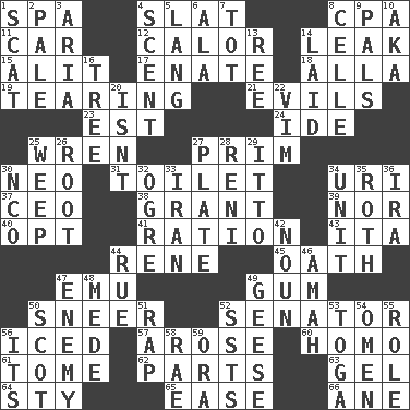 ACROSS 1. Health resort 4. Narrow board 8. Tax preparer (abbr.) 11. Auto 12. Bodily heat indicating an inflammation 14. Path through which fluid escapes 15. Came down and settled, as after flight 17. Related on the mother's side 18. Silent film actress Nazimova 19. Pulling apart 21. Vices 23. Eastern Standard Time (abbr.) 24. Binary compound 25. Songbird 27. Demure 30. Modern: prefix 31. Bathroom 34. RI univ. 37. Corporate head (abbr.) 38. Let have 39. Not either 40. Elect 41. Food allowance for one day 43. Call ___ day 44. French philosopher Descartes 45. Pledge 47. Australian flightless bird 49. Chewing product 50. Scornful expression 52. Elected representative 56. On the rocks 57. Came up 60. Like (prefix) 61. Heavy book 62. Components 63. Set 64. Filthy place 65. Comfort 66. One (Scot) DOWN 1. Scram! 2. Diluted with white 3. Operatic vocal solo 4. Odor 5. Long (Scottish) 6. According to 7. Small child 8. Cell (Danish) 9. Friends 10. Alias (abbr.) 13. To sift 14. Put down 16. Relationship diagram 20. Is not 22. Zeal 25. Shed a tear 26. Carrot, for example 27. Food holder 28. Painter Guido (1575-1642) 29. "Tell ____ the Marines!" 30. Non-commissioned officer (abbr.) 32. Legendary monster 33. SW Asia republic 34. A single undivided whole 35. Writer of Portnoy's Complaint (1969) 36. Retirement account (abbr.) 42. Part of speech 44. Sorrow 46. Housemaid 47. Foe 48. Ancient Persian 49. Honkers 50. Native of Scotland 51. Reproach for some lapse or misdeed 52. Fast planes 53. Ancient Roman robe 54. Sign of something about to happen 55. Hero or heavy, e.g. 56. It is 58. Actress Charlotte 59. Mouth or opening