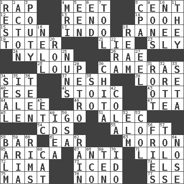 ACROSS 1. Reproach for some lapse or misdeed 4. Rendezvous 8. Penny 12. Environmental prefix 13. Former U.S. Attorney General Janet 14. "Silly old bear" 15. Surprise greatly 17. _ china 18. Indian princess (variant) 19. Carrier 21. Falsehood 23. Roguish 24. Thermoplastic polyamide 26. Actress Charlotte 28. Central Nebraska county 30. Devices for capturing images 34. Be seated 37. Delicate 39. Old wives' tales, e.g. 40. Compass dir. 41. Unemotional 43. Baseball player Mel 44. Toward shelter 46. Printing process, for short 47. Beverage made from leaves 48. Small, flat, pigmented spot on the skin 51. Actor Baldwin 54. Music discs 55. High up in or into the air 58. Drinking establishment 61. Ewer handle 63. Person of subnormal intelligence 65. N. Chile seaport 67. Opposed to 71. _ and Stitch 72. Pale green bean 73. On the rocks 74. Raised railways 75. Vertical spar for supporting sails 76. Words to Nanette 77. Compass dir. DOWN 1. Respite 2. Gambison 3. Inclined to pout 4. Medical imaging device (abbr.) 5. Car or cant ending 6. Conclude 7. Instrument 8. Accounting whiz (abbr.) 9. Immeasurably long periods of time 10. Christmas carol 11. Those people 16. 1994 drama film starring Jodie Foster 18. 480, 500 or 516 sheets of paper 20. Friend of Pooh 22. Retirement account (abbr.) 25. Religious women 27. Snakelike fish 29. Stone: prefix 30. Riviera of "Kiss of the Spider Woman" 31. Carrot, for example 32. Johnson of "Laugh-In" 33. Bristle 34. Lick closed 35. Capri or Wight 36. Adolescent 38. "Barney Miller" actor Jack 42. Root beer relative 45. And so on (abbr.) 49. It may be bright or harebrained 50. Girls' org. (abbr.) 52. Shade tree 53. Calm and collected 56. Strips of potato fried in deep fat 57. For Whom the Bell _____ 58. Lip ointment 59. Operatic vocal solo 60. Basketball hoops 62. Precipitation 64. Sense of smell 66. Domesticated feline 68. Non-commissioned officer (abbr.) 69. "___ Little Indians" 70. Wedding promise