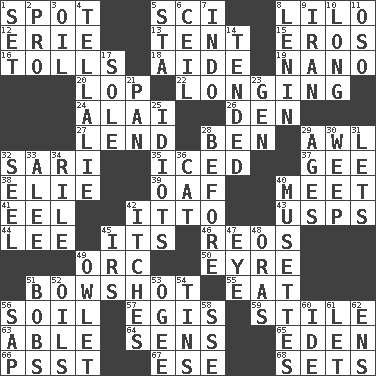 ACROSS 1. Blemish 5. _-fi 8. _ and Stitch 12. One of the Great Lakes 13. Portable shelter 15. Greek god of love 16. For Whom the Bell _____ 18. Helper 19. Billionth: prefix 20. Chop off 22. Yearning 24. Jai _ 26. Lair 27. Grant temporary use of 28. Benjamin's nick name 29. Leather borer 32. Indian skirt 35. On the rocks 37. Turn to the right 38. Writer Wiesel 39. Clumsy lout 40. Rendezvous 41. Snakelike fish 42. "Tell ____ the Marines!" 43. United States Postal Service (abbr.) 44. Area sheltered from the wind 45. It is 46. Vintage cars 49. The grampus (Milton) 50. Jane of fiction 51. The distance a bow sends an arrow 55. Erode 56. The visible part of the earth's surface 57. The front part of a cuirass 59. Vertical member of a panel or frame 63. Competent 64. Elected reps. 65. Paradise 66. Inconspicuous attention getter 67. Compass dir. 68. Puts into a specified state DOWN 1. Arrange properly for use 2. Adept person 3. Lubricate 4. Copy Pinocchio 5. R.R. building 6. To provide with a ceiling 7. _ china 8. Soviet premier 1918-24 9. SW Asia republic 10. Protracted 11. Bear (Spanish) 14. Watched over 17. Flatfish 21. Baking dish 23. Commissioned mil. rank 25. Foolish or stupid persons 28. Prior to 29. Grows older 30. Shed a tear 31. Allows 32. Stitch closed the eyes of (a falcon) 33. Toward shelter 34. Cause heat under the collar 36. Domesticated feline 40. French bagpipes 42. Irritating cutaneous sensations 45. Big collection agency 47. Sight organ 48. Mouths or openings 49. A small or young owl 51. Moves up and down 52. Lubricates 53. Double curve, resembling the letter S 54. Metal containers 56. Plant excrement 58. Compass dir. 60. Binary compound 61. Allow 62. Followers of ems