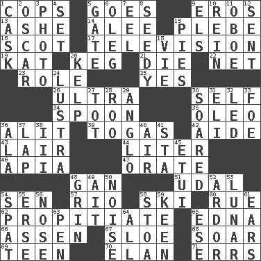 ACROSS 1. 911 reaches them 5. Travels 9. Greek god of love 13. American tennis player Robert 14. Toward shelter 15. Military trainee 16. Native of Scotland 17. Boob tube 19. Krazy ___ of comics 20. Barrel 21. Expire 22. Fish or hair follower 23. Hero or heavy, e.g. 25. It is so 26. Extremist 30. Itself 34. Soup utensil 35. Margarine 36. Came down and settled, as after flight 39. Ancient Roman robes 42. Assistant 43. Den 44. 61 cubic inches 46. Capital of Western Samoa 47. Declaim 48. Separate the seeds from cotton 51. Freehold land 54. Elected rep. 57. _ de Janeiro 58. What Jean-Claude Killy likes to do 60. Regret 62. Conciliate 65. Pulitzer Prize-winning author Ferber 66. NE Netherlands city 67. A type of plum 68. Fly high 69. Adolescent 70. Flair 71. Blunders DOWN 1. Keg 2. Witty Wilde 3. Picture 4. Arrange properly for use 5. Yard entry 6. Cassini of fashion 7. Snakelike fish 8. Shabby and untidy 9. Raised railways 10. It's straight from the horse's mouth 11. Mitch Miller's instrument 12. Posted 15. Sliced desserts 18. Compete 20. Seaweed 24. A period of five years 27. Small child 28. Friend of Pooh 29. White American of non-Hispanic descent 30. Flew 31. Connecticut Ivy Leaguer 32. Directed 33. Enemy 36. According to 37. Pet locale 38. One more than two 40. Wind 41. R.R. building 45. Needle holder 48. Amused look 49. Small island 50. Annoying sound 52. Zeal 53. Type of eclipse 54. Petty quarrel 55. Celtic language 56. Sense of smell 58. Portico 59. Peachy ____! 61. Hearing organs 63. Writing instrument 64. Everything 65. Compass dir.