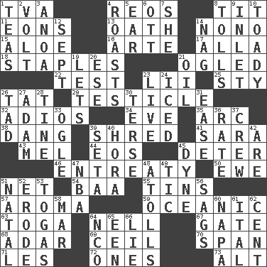 ACROSS 1. Federal power corp. 4. Vintage cars 8. Teat (slang) 11. Immeasurably long periods of time 13. Pledge 14. Words to Nanette 15. _ vera 16. Johnson of "Laugh-In" 17. Silent film actress Nazimova 18. Paper fasteners 21. Stared at amorously 22. Trial 23. Cards in a Roman deck? 25. Filthy place 26. Make lace 29. One of the two male reproductive glands 32. Goodbye (Sp.) 34. Night before a holiday 35. Curve 38. Mild oath, euphamism for damn 39. Fragment 41. "Two Mules for Sister ____" 43. Cartoonist voice _ Blanc 44. Greek goddess of the dawn 45. Prevent from occurring 46. Plea 50. She-sheep 51. Fish or hair follower 54. Sound made by sheep 55. Metal containers 57. Scent 59. Pertaining to the sea 63. Ancient Roman robe 64. 1994 drama film starring Jodie Foster 67. Yard entry 68. The sixth month of the Jewish calendar 69. To provide with a ceiling 70. Connect, as a bridge 71. French article 72. Singles 73. The first octave above the treble staff DOWN 1. Beverages made from leaves 2. Electrical Unit 3. Small Philippine buffalo 4. Ridicules or criticizes harshly 5. Ewer handle 6. Baseball player Mel 7. A female animal or person 8. For Whom the Bell _____ 9. An arm off of a larger body of water 10. Sycophant 12. Back-to-school mo. 14. Tired old horse 19. Allows 20. Compass dir. 21. Petroleum 23. Not recorded 24. On the rocks 26. Bit 27. First man 28. Prong on a fork 30. Laconic 31. Comfort 33. Stare at amorously 36. Pace 37. Ship's personnel 39. Bristle 40. Israeli folk dance 42. "We ___ not amused" (Victoria) 45. Centimeter-gram-second unit of force 47. Basketball assoc. 48. Ringlike coral islands and reefs 49. Nervous spasm 51. Relating to or accompanying birth 52. Eat (away) 53. Ancient Roman robes 56. Droops 58. Spoil 60. California wine valley 61. Slanted text style (abbr.) 62. Penny 64. Non-commissioned officer (abbr.) 65. Car or cant ending 66. Untruth