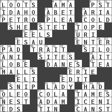 ACROSS 1. Plunders 6. Housemaid (var.) 9. Pacific Standard Time (abbr.) 12. Potato state 13. Collude with 14. Roberta Peters solo 15. Stone: prefix 16. Entreaty 17. Having a low temperature 18. A female animal or person 19. Proofreading order 20. Drink excessively 21. Snakelike fish 23. RI univ. 24. Son of Isaac 25. Keyboard key 28. Writing tablet 30. Distinguishing feature 34. Grain storage tower 35. Cuckoo 36. Settings 38. Small island 39. Ear part 41. Natives or inhabitants of Denmark 43. Beverage made from leaves 44. Shopping centers 46. One of the Great Lakes 48. Biblical high priest 49. Prepare for publication 50. Sever or remove by pinching or nipping 51. Kenny Rogers chart-topper in '80 53. Possessed 56. Margarine 57. Root beer relative 58. Corrects by punishment or discipline 60. A home for chicks 61. First man 62. Ancient Celtic tribe of eastern Britain 63. Begley and Asner 64. Shallow baking pan 65. 2nd pers. sing. pres. of can (arch.) DOWN 1. Mouth edge 2. Lyric poems 3. Pledge 4. Threesomes 5. "Barney Miller" actor Jack 6. Competent 7. Rendezvous 8. _ moment's notice (2 wds.) 9. Conciliate 10. Filth; sediment 11. Small boy 13. Flats, for short 14. Oak nuts 19. Disparaging remarks 20. Third day of the wk. 22. Consume 24. The property of being fit to eat 26. Writer Wiesel 27. Round or rotation of duties 28. Inside of hand 29. Small Philippine buffalo 31. Help 32. Call ___ day 33. "___ Little Indians" 37. Shabby and untidy 40. American author Paul (1891-1958) 42. Indian title of respect (Mr.) 45. Small drink 47. New York city 49. Dutch treat 50. Downhill vehicle 51. Farming town in central California 52. ____ Jay Lerner 54. So be it 55. Lairs 56. Single 57. Feline 58. Nervous spasm 59. Be seated