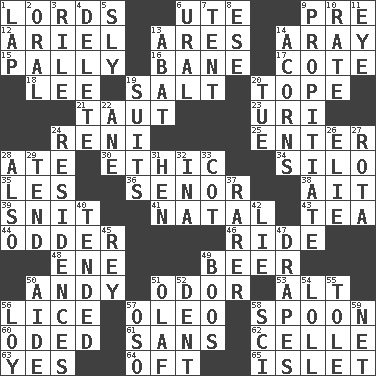 ACROSS 1. Nobles 6. Shoshoni 9. Before (prefix) 12. Satellite of Uranus 13. Ancient Greek god of war 14. Like ___ of sunshine 15. Friendly 16. Object of repulsion 17. ____ d'Azur (French Riviera) 18. Area sheltered from the wind 19. Table seasoning 20. Drink excessively 21. Strained 23. RI univ. 24. Painter Guido (1575-1642) 25. Keyboard key 28. Had dinner 30. Principle of right and wrong 34. Grain storage tower 35. French article 36. Sir (Sp.) 38. Small island 39. In a ____ (agitated or irritated) 41. Relating to or accompanying birth 43. Afternoon social gathering 44. More peculiar 46. Travel on an animal 48. Compass dir. 49. Fermented drink made from hops 50. Actor Griffith 51. Scent 53. Keyboard modifier key 56. Louse (plural) 57. Butter sub 58. Soup utensil 60. Wrote a lyric poem 61. Without 62. Cell (Danish) 63. It is so 64. Often (poetically) 65. Small island DOWN 1. Pet locale 2. Of the mouth 3. Cause heat under the collar 4. Keyboard key 5. Stealthy 6. Mountain range 7. Portable shelter 8. Compass dir. 9. Appease 10. Assign a rank or rating to 11. Sight organ 13. Blind as ____ 14. Oak nuts 19. Sets or collections 20. Third day of the wk. 22. A saturated hydrocarbon 24. Dwellings 26. Writer Wiesel 27. Round or rotation of duties 28. In addition 29. Watch over 31. Layer 32. _ tizzy (2 wds.) 33. Small bed 37. More valued for its uncommonness 40. Watched over 42. Falsehood 45. Marina Del _, California 47. Window treatments 49. Expressions of contempt or scorn 50. Assistant 51. Norwegian king 52. Undesirable depression on a surface 54. Hang loosely or laxly 55. Lacquered or enameled metalware 56. Myrna of the movies 57. Bear (Spanish) 58. _-fi 59. Remaining after all deductions