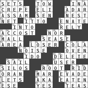 ACROSS 1. Arranges properly for use 5. Pull behind 8. _ tizzy (2 wds.) 11. Streamer paper 13. Connecticut Ivy Leaguer 14. The sixth month of the Jewish calendar 15. Indian state 16. Elected rep. 17. A home for chicks 18. Remaining after all deductions 19. "Tell ____ the Marines!" 21. Maternal 22. To the inside or interior of 24. Have confidence or faith in 25. Buttonhole 27. Not either 29. Promenade 30. Gospel singer Marvin 32. Type of rug 33. Failure 35. Root beer relative 39. Annoying sound 41. Baking chamber 42. Wedding promise 43. Erase 45. Move on water 48. One who makes use of a thing 49. Grain storage towers 50. Carrot, for example 52. To free from 55. NW Algerian seaport 56. Make imperfect 57. Elude 59. Allows 60. Alias (abbr.) 61. Consumed 62. Compass dir. 63. Affirmative reply 64. Beverages made from leaves DOWN 1. Examine hastily 2. Celtic language 3. One of the two male reproductive glands 4. Health resort 5. Trial 6. Butter sub 7. Acquire through effort 8. Perfect 9. Difficult 10. Johnson of "Laugh-In" 12. Gives off 14. Singer Murray 20. Small child 21. Blunders 23. Pitcher Ryan 25. Housemaid (var.) 26. Auto 27. Born 28. Boat paddle 30. Compass dir. 31. Learning spot: Fr. 33. Flaplike covering 34. Bear (Spanish) 36. Make much ado about nothing 37. Allow 38. One (Scot) 40. Lubricates 43. Superhero pair 44. First name in cosmetics 45. Male parents of animals 46. Having winglike extensions 47. Charged particles 49. Flatfish 50. Immoral or dissolute person 51. Mouths or openings 53. It may be bright or harebrained 54. Habitations of wild animals 56. Fifth month 58. Large container