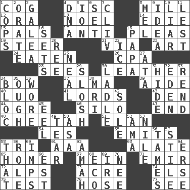 ACROSS 1. Gear tooth 4. Compact _ 8. Place where flour is made 12. Mouth or opening 13. Christmas carol 14. Singer Brickell 15. Friends 17. Opposed to 18. Entreaties 19. Guide 21. By way of 23. Nonscientific branch of learning 24. Ingested 26. Tax preparer (abbr.) 28. Observes 30. Cordwainer's material 34. Ribbon knot 37. _ mater 39. Helper 40. Nilotic language 41. Nobles 43. Lair 44. Legendary monster 46. Grain storage tower 47. Conclude 48. Leopard's kin 51. Liveliness 54. French article 55. Sends forth 58. Three (prefix) 61. Auto club (abbr.) 63. Having winglike extensions 65. Baseball hit which scores a run 67. Count _ (2 wds.) 71. Arab leader 72. High mountains 73. Measure of real estate 74. Raised railways 75. Trial 76. Flexible conduit 77. Observe DOWN 1. 911 reaches them 2. Speak pompously 3. An organ shaped like a helmet 4. Heredity factor (abbr.) 5. Electrically charged atom 6. Put into a specified state 7. 154 in Roman numerals 8. Cartoonist voice _ Blanc 9. It may be bright or harebrained 10. One who doesn't tell the truth 11. For fear that 16. Puts into a specified state 18. Dad 20. Portuguese money of account (variant) 22. Frozen water 25. Anneal 27. _ moment's notice (2 wds.) 29. Splash clumsily 30. Dipping utensil 31. Flintstone garb 32. Genesis locale 33. Tear apart 34. Alliance 35. Ending for "Through" and "Enough" 36. Had on 38. Medical imaging device (abbr.) 42. Not divided or shared with others 45. Snakelike fish 49. Pull into pieces 50. White ___ sheet 52. Housemaid (var.) 53. Mediterranean tributary 56. Makes less strong or intense 57. Vertical member of a panel or frame 58. Not this but _ 59. Hero or heavy, e.g. 60. Naughty children 62. Housemaid 64. Celtic language 66. Eastern Standard Time (abbr.) 68. Environmental prefix 69. Big collection agency 70. Born
