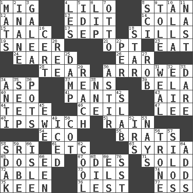ACROSS 1. Russian fighter aircraft 4. _ and Stitch 8. Comedian Laurel of Laurel & Hardy 12. Santa ___, CA 13. Prepare for publication 14. Root beer relative 15. Baby powder 17. Back-to-school mo. 18. Beverly of Met fame 19. Scornful expression 21. Choose 23. Consume 24. Having ears or earlike features 26. Hearing organ 28. Pull into pieces 30. Moved like an arrow 34. Cleo's killer 37. Not women's 39. Actor Lugosi 40. Modern: prefix 41. Leg coverings 43. Wind 44. False hair 46. To provide with a ceiling 47. Area sheltered from the wind 48. NE Massachusetts town 51. Water falling in drops from the sky 54. Environmental prefix 55. Naughty children 58. Indian title of respect (Mr.) 61. And so on (abbr.) 63. Damascus' land 65. Administered medicine 67. Lyric poems 71. Exchanged or delivered for money 72. Competent 73. Petroleums 74. Lower and raise head in agreement 75. Peachy ____! 76. For fear that 77. Double-curved letter DOWN 1. Floor protectors 2. Empty; void 3. An organ shaped like a helmet 4. French article 5. Binary compound 6. Mouth edge 7. "Beetle Bailey" pooch 8. _-fi 9. Lacquered or enameled metalware 10. Silent film actress Nazimova 11. Political cartoonist Thomas 16. Foregone conclusion 18. Play the lead 20. To separate or throw off 22. For each 25. Moist 27. Director Reiner 29. Arrive at 30. Having gotten out of bed 31. Welt 32. Writer Wiesel 33. Have the gumption 34. Opposed to 35. Ooze 36. Cooking vessels 38. Compass dir. 42. Thick slice 45. She-sheep 49. On the rocks 50. Small bed 52. Big collection agency 53. Negative votes 56. Heavy duty weighing machine 57. Grain storage towers 58. Neighbor of Neb. 59. Loose flowing garment 60. Small island 62. Calm and collected 64. Sums up 66. Car or cant ending 68. Expire 69. Raised railways 70. Fast jet (abbr.)