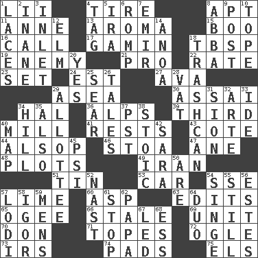 ACROSS 1. Cards in a Roman deck? 4. Become fatigued 8. Fitting 11. Singer Murray 13. Scent 15. Sometimes accompanies a hiss 16. Give a ring to 17. Homeless child 18. Cook's measure (abbr.) 19. Foe 21. Adept person 22. Assign a rank or rating to 23. Put into a specified state 24. Eastern Standard Time (abbr.) 27. Actress Gardner 29. Toward the sea 30. Slender Brazilian palm 34. Actor Linden 36. High mountains 39. One of three equal parts 40. Place where flour is made 41. Musical pauses 43. ____ d'Azur (French Riviera) 44. Columnist Joseph or Stewart 46. Portico 47. A saturated hydrocarbon 48. Secret plans 49. SW Asia republic 51. Shallow baking pan 53. Auto 54. Compass dir. 57. Citrus frut 60. Cleo's killer 63. Proofreads 65. Double curve, resembling the letter S 66. Lacking originality or spontaneity 69. A single undivided whole 70. Spanish title 71. Drinks excessively 72. Stare 73. Big collection agency 74. Groovy apts. 75. Raised railways DOWN 1. Shoestrings 2. Silly 3. An arm off of a larger body of water 4. Label 5. Retirement account (abbr.) 6. Frolic 7. Independent ruler or chieftain 8. Swedish rock group 9. Mail 10. Drink excessively 12. Shade tree 14. Small Philippine buffalo 18. File 13 20. It is so 25. Scorch 26. Falsehoods 28. Large container 29. One to whom something is allotted 31. The Jewish people; Israel 32. Johnson of "Laugh-In" 33. Binary compound 34. Land elevation 35. In addition 37. Pacific Standard Time (abbr.) 38. Unemotional 40. Atlas unit 42. "Two Mules for Sister ____" 45. 23rd letter of the Greek alphabet 50. "We ___ not amused" (Victoria) 52. Political cartoonist Thomas 54. Scorch 55. Free of sound 56. _____ Park, CO 57. Farming town in central California 58. Russian composer Stravinsky 59. Not women's 61. Discontinue 62. Dad 64. Superhero pair 67. Directed 68. Double-curved letter