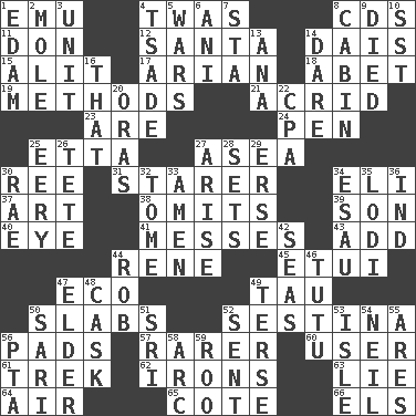 ACROSS 1. Australian flightless bird 4. It was, poetically 8. Music discs 11. Spanish title 12. Before Barbara or Clara 14. Raised platform 15. Set down 17. Believer in; advocate of (suffix) 18. Collude with 19. Modes 21. Bitter 23. "We ___ not amused" (Victoria) 24. Fenced enclosure 25. Singer James 27. Toward the sea 30. To sift 31. A viewer who gazes fixedly 34. Biblical high priest 37. Tate display 38. Leaves out 39. Male offspring 40. Sight organ 41. Makes clutter 43. Find the sum of 44. French philosopher Descartes 45. Needle holder 47. Environmental prefix 49. The 19th letter of the Greek alphabet 50. Broad, flat, thick pieces 52. French poetic form 56. Groovy apts. 57. More uncommon 60. One who makes use of a thing 61. Long journey 62. Removes the wrinkles 63. Whopper 64. Atmosphere 65. ____ d'Azur (French Riviera) 66. Raised railways DOWN 1. Dutch treat 2. Undercover agent 3. A single undivided whole 4. Sadhe (variant) 5. Armed conflicts 6. Cuckoo 7. R.R. building 8. Small house or cottage 9. Passed on 10. Fast jet (abbr.) 13. Santa ___, CA 14. Have the gumption 16. Not this but _ 20. Mouths or openings 22. Numbers guy (abbr.) 25. Suggestive of the supernatural 26. Wig 27. Ascend 28. Arranges properly for use 29. Celtic language 30. Actress Charlotte 32. Heavy book 33. So be it 34. He sold his birthright 35. Farming town in central California 36. Working for oneself (abbr.) 42. Oceans 44. Director Reiner 46. Ballerina skirt 47. A person who is older than you are 48. Keg 49. Laconic 50. Indian skirt 51. _ Lanka 52. Emitted 53. Small island 54. Famous astronaut Armstrong 55. Ancient Greek god of war 56. Parent Teacher Assoc. 58. Curve 59. Friend of Pooh