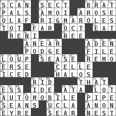 ACROSS 1. Glance over 5. Religious group 9. Naughty child 13. Friends 14. Mine, in Marseilles 15. Came up 16. Norwegian king 17. Complicated, petty procedures 19. Small child 20. At a great distance 21. Sep. follower 22. Ingest 23. Painter Guido (1575-1642) 25. Portuguese money of account (variant) 26. Approach 30. An important port of Yemen 34. Plash 35. Do some clerical work 36. Central Nebraska county 39. Gospel singer Marvin 42. San ____ (Riviera town) 43. Celtic language 44. Cell (Danish) 46. On the rocks 47. Radiant circles of light 48. To free from 51. Not this but _ 54. Curvy letter 57. Binary compound 58. "One Day ___ Time" 60. Car dealer's back yard 62. Car 65. Corncob 66. Actors Connery and Penn 67. Southern CA. univ. 68. Soon (poet.) 69. Jane of fiction 70. Scorch 71. Egg locale DOWN 1. Blemish 2. Bodily heat indicating an inflammation 3. Having winglike extensions 4. Overdraft (abbr.) 5. "Two Mules for Sister ____" 6. Independent ruler or chieftain 7. Gear tooth 8. Southeast Indonesia island 9. Sis' sibling 10. Hero or heavy, e.g. 11. At sea 12. Trial 15. Johnson of "Laugh-In" 18. Adept person 20. Fine (Spanish) 24. Slept 27. Begley and Asner 28. Grow older 29. Arrive at 30. Anew 31. Pass on 32. Shade tree 33. Modern: prefix 36. Flowery wreath 37. The grampus (Milton) 38. Purpose 40. Ocean 41. Pipe bend 45. Globular water bottle used in Asia 48. Basketball hoops 49. Wedding promise 50. To get out of a bus 52. Place in a line 53. Traditional theme or motif 54. Comfort 55. Chop _ 56. Play the lead 58. Silent film actress Nazimova 59. Separate forcefully 61. Portable shelter 63. Single 64. Frozen water 65. Baking dish