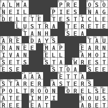 ACROSS 1. _ mater 5. Before (prefix) 8. Bear (Spanish) 11. Famous astronaut Armstrong 12. Sliced desserts 13. Tired old horse 14. Erase 17. One of the two male reproductive glands 19. A period of five years 21. Cylindrical with tapered ends 22. Hyperbolic tangent 23. Ocean 24. "We ___ not amused" (Victoria) 27. 24-hour periods 29. The 19th letter of the Greek alphabet 32. The wife of a rajah (variant) 34. Atlas unit 36. Merit 37. _ the terrible 38. Pipe bend 39. Mine, in Marseilles 40. Arranges properly for use 41. R.R. building 42. Obtain by seizing forcibly or violently 43. Compass dir. 44. Portico 46. Perceive with the eye 47. Auto club (abbr.) 50. Singer James 52. A viewer who gazes fixedly 55. Michaelmas daisies 57. Characterized by complete cowardliness 59. Threatening words 62. Had dinner 63. Body of Kaffir warriors 64. Horse sense 65. To sift 66. Consume 67. Collude with DOWN 1. Plus 2. Area sheltered from the wind 3. Place where flour is made 4. Native American of Southwest Alaska 5. Sliced dessert 6. Musical pauses 7. First name in cosmetics 8. Single time 9. Table seasoning 10. Double curve, resembling the letter S 12. Parent Teacher Association (abbr.) 15. Sadhe (variant) 16. Inactive volcano in Sicily 18. Lyricist Gershwin 20. Poems 24. Get up 25. All-night dance parties 26. Related on the mother's side 28. Table seasonings 29. Corrects by punishment or discipline 30. Came up 31. Join together 33. Followers of ems 35. Food holders 36. Ewer handle 42. Wetness 45. "Beetle Bailey" pooch 47. Nonscientific branch of learning 48. Nest on high 49. Scent 51. Sports stadium 52. Practice fight 53. Lug 54. Toward shelter 55. Cuckoo 56. Messy guy 58. Elect 60. Take to court 61. Eastern Standard Time (abbr.)