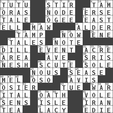 ACROSS 1. Ballerina skirt 5. Use a spoon 9. Scottish cap 12. Mouths or openings 13. Thickened enlargement 14. Celtic language 15. Lie 16. Double curve, resembling the letter S 17. 90 degrees 18. Pipe bend 19. Informal term for the mouth 21. Tree or shrub in the Birch family 22. Pack (down) 24. At this time 26. Compass dir. 27. Lies 28. Musical sound 29. Deli pickle 30. Incident 32. Land measure 36. Length times width 37. "___ Maria" 38. Indian titles of respect 39. Tender 40. Turtle shell scale 42. Not divided or shared with others 43. Common sense 44. Gospel singer Marvin 46. Cartoonist voice _ Blanc 49. Bear (Spanish) 50. Deliberation 51. Flexible twig of a willow tree 53. Third day of the wk. 54. Armed conflict 57. Slanted text style (abbr.) 58. Pledge 61. Short-tailed, large-bodied rat 62. Elected reps. 63. Capri or Wight 64. SW Asia republic 65. Afternoon social gathering 66. Made of lace 67. Singer Brickell DOWN 1. Carryall 2. Mountain range 3. Baron Munchausen's specialties 4. Purpose 5. Frozen precipitation 6. Coat; cloak 7. Binary compound 8. Portuguese money of account (variant) 9. Buy and sell 10. NE Netherlands city 11. Distance measurement (Brit.) 14. Snakelike fish 19. Madame (abbr.) 20. Domed church section 21. Deep reverence 23. Assad's deity 24. Music written for nine 25. Baseball player Mel 27. Hoop that covers a wheel 28. Congenital growth or mark on the skin 29. One of the 12 tribes of Israel 31. In a vacuum (with "in") 32. Slender Brazilian palm 33. What you're doing now 34. Cause heat under the collar 35. Compass dir. 40. Distress signal 41. Son of Isaac 43. And not 45. Night before a holiday 46. Damp 47. First name in cosmetics 48. Woody, climbing, usually tropical plant 52. Raised railways 53. Those things 55. Jai _ 56. French philosopher Descartes 58. Lubricate 59. White ___ sheet 60. Affectionate concern, for short 61. Compete