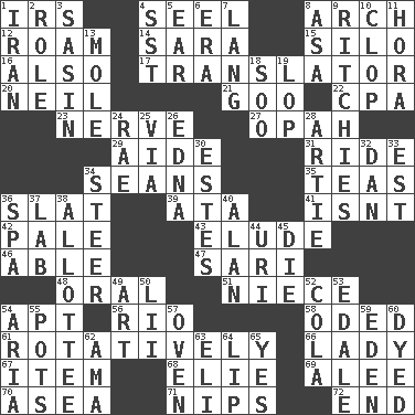 ACROSS 1. Big collection agency 4. Stitch closed the eyes of (a falcon) 8. Bowlike part 12. Wander 14. "Two Mules for Sister ____" 15. Grain storage tower 16. In addition 17. Interpreter 20. Famous astronaut Armstrong 21. Thick or sticky substance 22. Accounting whiz (abbr.) 23. Boldness 27. Brightly colored fish 29. Assistant 31. Travel on or in a vehicle 34. Actors Connery and Penn 35. Beverages made from leaves 36. Narrow board 39. "One Day ___ Time" 41. Is not 42. Diluted with white 43. Dodge 46. Competent 47. Indian skirt 48. Of the mouth 51. Sibling's daughter 54. Fitting 56. _ de Janeiro 58. Wrote a lyric poem 61. Happening in regular succession 66. Kenny Rogers chart-topper in '80 67. A whole individual unit 68. Writer Wiesel 69. Toward shelter 70. Toward the sea 71. Cuts off 72. Conclusion DOWN 1. SW Asia republic 2. Hero or heavy, e.g. 3. Indian antelope 4. Fast jet (abbr.) 5. Ewer handle 6. Epoch 7. Long (Scottish) 8. White ___ sheet 9. Actors Guy, Robert Welles, and Clint 10. Hoof sound 11. Israeli folk dance 13. Undercover agent 18. "Barney Miller" actor Jack 19. Trim (branches) 24. Actress Charlotte 25. By way of 26. Pulitzer Prize-winning author Ferber 28. Nick name for Arthur 30. _____ Park, CO 32. One of the 12 tribes of Israel 33. Eastern Standard Time (abbr.) 34. Guide 36. Health resort 37. Experiment locale 38. One to whom something is allotted 40. ____ Jay Lerner 44. RI univ. 45. Expire 49. Tate display 50. Cards in a Roman deck? 52. Root beer relative 53. Peak District village in England 54. Roberta Peters solo 55. Cooking vessels 57. Baking chamber 59. Paradise 60. Colored 62. Housemaid (var.) 63. Biblical high priest 64. Mouth edge 65. Consenting reply
