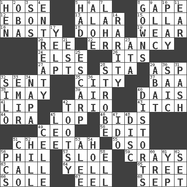 ACROSS 1. Flexible conduit 5. Actor Linden 8. Stare wonderingly 12. Inky black, to poets 13. Having or resembling wings 15. Water jar 16. Smutty 18. Capital of the state of Qatar 19. Put on (as clothing) 20. To sift 22. The state or an instance of erring 24. Otherwise 26. ___ a Wonderful Life 27. Flats, for short 28. R.R. building 29. Viper 32. Emitted 35. Municipality 37. Sound made by sheep 38. "If ____ say so..." 39. Atmosphere 40. Raised platform 41. Mouth edge 42. Musical group of three 43. Hankering 44. Mouth or opening 45. Chop off 46. Auction offers 49. Corporate head (abbr.) 50. Prepare for publication 51. Leopard's kin 55. Bear (Spanish) 56. Silvers or Donahue 57. A type of plum 59. Trading vessels 63. Give a ring to 64. Shout 65. Woody plant 66. Not divided or shared with others 67. Snakelike fish 68. Back-to-school mo. DOWN 1. Layer 2. Chief or king in Benin or Nigeria 3. Mayday 4. Plea 5. Possessed 6. Medicinal plant 7. Cowardly lion portrayer 8. Long dresses 9. Actor Baldwin 10. Shaw product 11. Ewer handle 14. Noteworthy scarcity 17. Sharp bark 21. Eastern Standard Time (abbr.) 23. "One Day ___ Time" 25. Fortification 28. Disco prop 29. Blind as ____ 30. Ketch in the Levant 31. Romantic infatuation 32. Grain storage tower 33. Independent ruler or chieftain 34. California wine valley 36. One more than two 40. What propaganda does 42. A girl or young woman (variant) 45. Area sheltered from the wind 47. Wedding promise 48. Compact _ 49. Cell (Danish) 51. US Secretary of Labor Elaine L. _ 52. Land elevation 53. Toward shelter 54. Hollow 56. Personal Computers (abbr.) 58. Pipe bend 60. "We ___ not amused" (Victoria) 61. Slangy assent 62. Put into a specified state