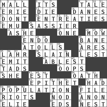 ACROSS 1. Shopping center 5. It is 8. Falsehood 12. One of the Great Lakes 13. Expire 14. Natives or inhabitants of Denmark 15. Do not 16. Pleas 19. Australian flightless bird 20. More impudent 21. American tennis player Robert 23. Single 24. Cut the grass 27. Inside; within (prefix) 30. Object of repulsion 31. Ringlike coral islands and reefs 34. Ancient Greek god of war 35. Cowardly lion portrayer 38. Killed 40. For fear that 41. Give off 42. Most capable 44. Bits 45. I made a mistake 46. A female animal or person 47. Eastern Standard Time (abbr.) 50. Pledge 53. Curse 57. Possessed 59. Census information 63. Do some clerical work 64. Debaucheries 65. Dreamland 66. Soon (poet.) 67. Writer Wiesel 68. Begley and Asner 69. Egg locale DOWN 1. Ancient Persian 2. Scent 3. "_ and Lucy" (Charlie Brown theme song) 4. Allow 5. It may be bright or harebrained 6. Canisters 7. Arranges properly for use 8. Make lace 9. Black tropical American cuckoo 10. Area sheltered from the wind 11. Double-curved letter 14. Have the gumption 17. _ de Janeiro 18. Car or cant ending 20. Posted 22. Centers 24. Female horse 25. Washington bills 26. 270 degrees 28. Two (Sp.) 29. Rounded earthenware pot or jar 30. Greek mezzo-soprano Agnes 32. Experiment locale 33. Grain storage tower 35. Allows 36. Wet nurse 37. Flintstone garb 39. Modern: prefix 43. Blemish 47. Snakelike fish 48. Health resort 49. Teat (slang) 51. One or ones belonging to thee 52. Saint headwear 54. Prong on a fork 55. Parka part 56. Conclusions 58. Undesirable depression on a surface 59. Before (prefix) 60. Petroleum 61. Luau course 62. Shoshoni 63. Air blower