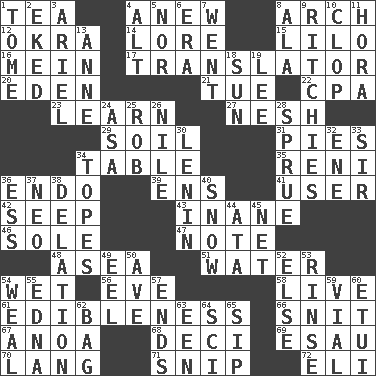 ACROSS 1. Beverage made from leaves 4. Afresh 8. Bowlike part 12. Gumbo ingredient 14. Old wives' tales, e.g. 15. _ and Stitch 16. Count _ (2 wds.) 17. Interpreter 20. Paradise 21. Third day of the wk. 22. Accounting whiz (abbr.) 23. Acquire or gain knowledge or skills 27. Soft 29. Earth 31. Sliced desserts 34. Eating place 35. Painter Guido (1575-1642) 36. Inside; within (prefix) 39. Followers of ems 41. One who makes use of a thing 42. Ooze 43. Empty; void 46. Flatfish 47. Musical sound 48. At sea 51. Wetness 54. Dripping 56. First lady 58. Not recorded 61. The property of being fit to eat 66. In a ____ (agitated or irritated) 67. Small Philippine buffalo 68. Tenth: prefix 69. He sold his birthright 70. Austrian-born American filmmaker Fritz 71. Sever or remove by pinching or nipping 72. Connecticut Ivy Leaguer DOWN 1. Heavy book 2. Made supply last 3. Satellite of Uranus 4. Keyboard modifier key 5. And not 6. Period 7. Left 8. Chicken ___ king 9. Actors Guy, Robert Welles, and Clint 10. Hoof sound 11. Israeli folk dance 13. Queen of England 1702-14 18. Player for Phoenix 19. Area sheltered from the wind 24. White ___ sheet 25. Director Reiner 26. Mediterranean tributary 28. Upset 30. Soviet premier 1918-24 32. Compass dir. 33. Title for a knight 34. Drinks excessively 36. Double-curved letter 37. Modern: prefix 38. Accusation by an informer 40. Overwhelm 44. _ moment's notice (2 wds.) 45. Fish or hair follower 49. Snakelike fish 50. "___ Maria" 52. Otherwise 53. Wash lightly 54. Welt 55. Pulitzer Prize-winning author Ferber 57. Extremities 59. Small bottle 60. Needle holder 62. Container for groceries 63. Car or cant ending 64. _-fi 65. Small drink