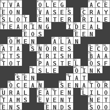 ACROSS 1. Federal power corp. 4. Cassini of fashion 8. Adept person 11. Period of immesurable duration 12. Flower holders 14. Supercomputer manufacturer 15. Notch 17. Keyboard key 18. Cause heat under the collar 19. Rending 21. Perfect 23. Greek goddess of the dawn 24. Car or cant ending 25. Sign of things to come 27. ____ Jay Lerner 30. _ moment's notice (2 wds.) 31. Sounds asleep 34. Environmental prefix 37. ___ a Wonderful Life 38. From or relating to Ireland 39. Sound made by sheep 40. Small child 41. Soft color 43. Order of Saint Francis (abbr.) 44. Capri or Wight 45. Pig sound 47. Elected rep. 49. Make lace 50. Sea 52. Legislator 56. Mountain range 57. Consumed 60. _ and Stitch 61. Scottish caps 62. Happening 63. Fish or hair follower 64. Followers of ems 65. Extremities 66. "Barney Miller" actor Jack DOWN 1. Trial 2. Grand slam 3. Small Philippine buffalo 4. Baking chambers 5. Austrian-born American filmmaker Fritz 6. Eastern Standard Time (abbr.) 7. Turn to the right 8. Believer in; advocate of (suffix) 9. Give a ring to 10. Sight organ 13. Indian title of respect (Mr.) 14. Algonquian 16. Relationship diagram 20. Charged particles 22. Lair 25. "Beetle Bailey" pooch 26. Vertical spar for supporting sails 27. Ascend 28. For fear that 29. American tennis player Robert 30. Small island 32. Cuts off 33. Relating to the mouth 34. Inky black, to poets 35. Keg 36. Clumsy lout 42. Grant temporary use of 44. _ tizzy (2 wds.) 46. Slanted text style (abbr.) 47. Fraudulent business schemes 48. Snakelike fish 49. Portable shelters 50. NW Algerian seaport 51. Born 52. Post 53. Metal containers 54. Margarine 55. Printing process, for short 56. Shoshoni 58. "___ Maria" 59. Nine, plus one