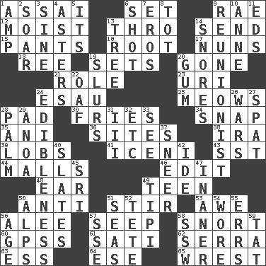 ACROSS 1. Slender Brazilian palm 6. Put into a specified state 9. Actress Charlotte 12. Damp 13. Through, poetically 14. Post 15. Leg coverings 16. Carrot, for example 17. Religious women 18. To riddle 19. Arranges properly for use 20. Went 21. Hero or heavy, e.g. 23. RI univ. 24. Son of Isaac 25. Catcalls? 28. Writing tablet 30. Strips of potato fried in deep fat 34. Fastener 35. Cuckoo 36. Locates 38. Lyricist Gershwin 39. Tennis shots 41. Ancient Celtic tribe of eastern Britain 43. Fast jet (abbr.) 44. Promenades 46. Prepare for publication 48. Hearing organ 49. Adolescent 50. Opposed to 51. Disorderly outburst 53. Deep reverence 56. Toward shelter 57. Ooze 58. Derisive sound 60. Global Positioning Systems (abbr.) 61. Suttee (variant) 62. Father Junipero _ 63. Double-curved letter 64. Compass dir. 65. Take or capture by force DOWN 1. Electrical Unit 2. Fly high 3. Trig term 4. Michaelmas daisies 5. It is 6. Went for two points 7. Greek god of love 8. Small child 9. One who advocates reunion 10. Singer Murray 11. Begley and Asner 13. Family _ (genealogy) 14. Sounds asleep 19. Plays smoothly or legato 20. Chewing product 22. Clumsy lout 24. The property of being fit to eat 26. Armed conflicts 27. Petty quarrel 28. Inside of hand 29. Small Philippine buffalo 31. One more than two 32. And so on (abbr.) 33. Observe 37. Contemptuous expression 40. Chalkboards 42. Binary compound 45. Indian title of respect (Mr.) 47. More lacking in sense or substance 49. Native american tent (variation) 50. High mountains 51. Oceans 52. Wig 54. Had on 55. Blunders 56. Personal question 57. Compass dir. 58. Compass dir. 59. Make lace