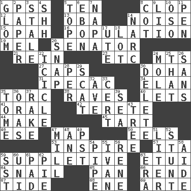 ACROSS 1. Global Positioning Systems (abbr.) 5. Nine, plus one 8. Hoof sound 12. Thin strip of wood or metal 13. Chief or king in Benin or Nigeria 14. Annoying sound 15. Brightly colored fish 16. Census information 19. Cartoonist voice _ Blanc 20. Legislator 21. It's straight from the horse's mouth 23. And so on (abbr.) 24. Mountains (abbr.) 27. Smile enhancers 30. Capital of the state of Qatar 31. Medicinal drug used to evoke vomiting 34. Liveliness 35. Torque (variant) 38. All-night dance parties 40. Allows 41. Of the mouth 42. Cylindrical with tapered ends 44. Create 45. Small pie 46. Compass dir. 47. Atlas unit 50. Snakelike fish 53. Heighten or intensify 57. Call ___ day 59. Supplying deficiencies 63. Needle case 64. Slow-paced one 65. Baking dish 66. Tear apart 67. Event that recurs at intervals 68. Compass dir. 69. Johnson of "Laugh-In" DOWN 1. Seize upon or latch onto something 2. Some stationery 3. Having lost freshness 4. Quiet! 5. Drink excessively 6. Inky black, to poets 7. California wine valley 8. Small bed 9. Cards in a Roman deck? 10. Bear (Spanish) 11. Writing instrument 14. Drug cop 17. Shoshoni 18. Car dealer's back yard 20. Fastener 22. Hanging ice 24. Undercover agent 25. Not this but _ 26. Without 28. For each 29. Leave at once 30. Erase 32. "___ Maria" 33. An absolute certainty 35. Heavy book 36. Mouths or openings 37. Libertine 39. Ocean 43. Relationship diagram 47. Place where flour is made 48. A saturated hydrocarbon 49. Pacific Standard Time (abbr.) 51. 61 cubic inches 52. Difficult or unusual or dangerous feat 54. Corncob 55. "Terrible" tsar 56. French philosopher Descartes 58. Helper 59. Fast jet (abbr.) 60. Corn or form start 61. Writing tablet 62. Sliced dessert 63. Epoch