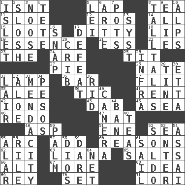 ACROSS 1. Is not 5. Pet locale 8. Beverage made from leaves 11. A type of plum 12. Greek god of love 14. 100% 15. Plunders 17. Simple song 18. Mouth edge 19. Substance 21. Curvy letter 22. French article 23. Definite Article 24. Sandy's bark 25. Teat (slang) 27. Sliced dessert 28. Nathan's nickname 31. Desk light 35. Drinking establishment 37. Sudden quick movement 38. Toward shelter 39. Nervous spasm 41. Monthly bill 42. Charged atoms 43. Apply (a substance) by light strokes 45. Toward the sea 46. Do over again 47. Floor covering 49. Cleo's killer 51. Compass dir. 52. Ocean 55. Curve 57. Find the sum of 60. Thinks logically 62. Cards in a Roman deck? 63. Climbing, woody, usually tropical vines 65. Table seasonings 66. Keyboard modifier key 67. Greater amount 68. It may be bright or harebrained 69. Marina Del _, California 70. Put into a specified state 71. Australian parrot (variant) DOWN 1. Small island 2. Agitate, as a liquid 3. Trap for birds or small mammals 4. Wig 5. Flowery wreath 6. Johnson of "Laugh-In" 7. Plant holders 8. Baron Munchausen's specialties 9. Writer Wiesel 10. High mountains 13. System (abbr.) 16. Fastener 17. Outscore 20. Baby bed with high sides 26. Kind of red light 29. Prong on a fork 30. Singer James 31. Den 32. Medicinal plant 33. Ananias' fault 34. Mexican monetary units 36. To free from 40. Device for capturing images 44. Object of repulsion 48. Beverages made from leaves 50. Inside of hand 52. Twentieth part of a lira 53. Keyboard key 54. Slender Brazilian palm 55. Having or resembling wings 56. Cause heat under the collar 58. "Vaya con ____" 59. Have the gumption 61. Move on water 64. Remaining after all deductions