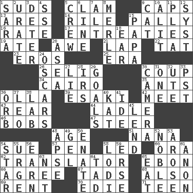 ACROSS 1. Beer foam 5. Dollar (slang) 9. Smile enhancers 13. Ancient Greek god of war 14. Cause heat under the collar 15. Chummy 16. Pace 17. Pleas 19. Had dinner 20. Deep reverence 21. Infant locale 22. Make lace 23. Greek god of love 25. Period 26. Major League Baseball Commissioner Bud 30. Overturn; upset 34. Capital of Egypt 35. Pismires 36. Rounded earthenware pot or jar 39. 1973 Nobel Price Winner (Physics) Leo 42. Confront 43. Hitchcock's "____ Window" 44. Dipping utensil 46. Moves up and down 47. Navigate 48. Grow older 51. Nanny 54. Take to court 57. Writing instrument 58. Directed 60. Mouth or opening 62. Interpreter 65. Inky black, to poets 66. Match 67. Small amounts or degrees 68. In addition 69. Monthly bill 70. Singer Brickell 71. Adolescent DOWN 1. "Two Mules for Sister ____" 2. A salt of uric acid 3. Prevent from occurring 4. Compass dir. 5. Group working together 6. Actor's bit 7. Keyboard modifier key 8. Haggard of country music 9. Domesticated feline 10. Set down 11. Entreaty 12. System (abbr.) 15. Dad 18. Hearing organ 20. At sea 24. Motion picture awards 27. Untruth 28. Big collection agency 29. Purposes of endeavors 30. Device for capturing images 31. Single 32. Shoshoni 33. Pacific Standard Time (abbr.) 36. Globe 37. Lion 38. Experiment locale 40. Krazy ___ of comics 41. Binary compound 45. Grant temporary use of 48. Domed church section 49. Set 50. Maternal 52. Having high moral qualities 53. Came up 54. Play the lead 55. Goad 56. Merit 58. Farming town in central California 59. Celtic language 61. At once, immediately (arch.) 63. Fish or hair follower 64. Small boy 65. Consume