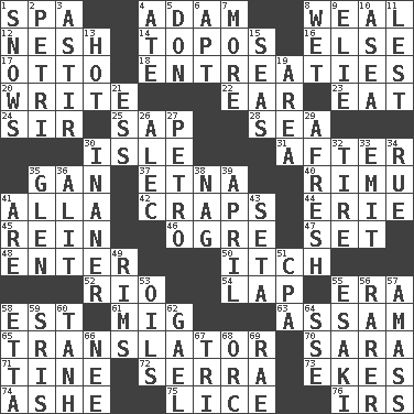 ACROSS 1. Health resort 4. First of billions? 8. Welt 12. Soft 14. Literary convention 16. Otherwise 17. "Beetle Bailey" pooch 18. Pleas 20. Compose 22. Ewer handle 23. Erode 24. Title for a knight 25. Plant excrement 28. Ocean 30. Capri or Wight 31. Following 35. Separate the seeds from cotton 37. Inactive volcano in Sicily 40. Tall New Zealand timber tree 41. Silent film actress Nazimova 42. Dice game 44. One of the Great Lakes 45. It's straight from the horse's mouth 46. Legendary monster 47. Put into a specified state 48. Keyboard key 50. Hankering 52. _ de Janeiro 54. Infant locale 55. Epoch 58. Eastern Standard Time (abbr.) 61. Russian fighter aircraft 63. Indian state 65. Interpreter 70. "Two Mules for Sister ____" 71. Prong on a fork 72. Father Junipero _ 73. Supplements with great effort 74. American tennis player Robert 75. Louse (plural) 76. Big collection agency DOWN 1. Frozen precipitation (plural) 2. _ dish (used to culture cells) 3. Moving or stirring 4. Had dinner 5. Spanish title 6. Fitting 7. Greater amount 8. Soggy 9. Writer Wiesel 10. At sea 11. For fear that 13. Being at a high temperature 15. Oceans 19. Type of rug 21. Double-curved letter 26. Actor Baldwin 27. Stone: prefix 29. Anew 30. More lacking in sense or substance 32. Become fatigued 33. Give off 34. Sorrow 35. Small, secluded valley 36. Set down 38. Tired old horse 39. Showery time 41. "We ___ not amused" (Victoria) 43. Bristle 49. Basketball hoops 51. Tax preparer (abbr.) 53. Petroleums 55. 1973 Nobel Price Winner (Physics) Leo 56. Less widely known 57. Collect or gather 58. Singer James 59. Indian titles of respect 60. Hyperbolic tangent 62. Highlander 64. Compass dir. 66. Born 67. Three (prefix) 68. The grampus (Milton) 69. Actress Charlotte