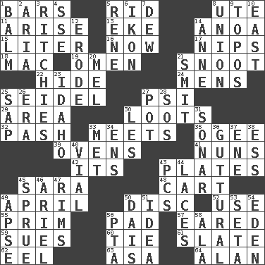 ACROSS 1. Soap units 5. To free from 8. Shoshoni 11. Get up 13. Supplement with great effort 14. Small Philippine buffalo 15. 61 cubic inches 16. Immediately 17. Cuts off 18. Apple computer (short form) 19. Sign of something about to happen 21. Snob 22. Flintstone garb 24. Not women's 25. A glass for beer 27. Air pressure measure (abbr.) 29. Length times width 30. Plunders 32. Romantic infatuation 33. Confronts 35. Double curve, resembling the letter S 39. Baking chambers 41. Religious women 42. ___ a Wonderful Life 43. Food holders 45. "Two Mules for Sister ____" 48. Haul 49. Showery time 50. Flat circle 52. Purpose 55. Demure 56. Writing tablet 57. Having ears or earlike features 59. Institutes legal proceedings 60. Make a knot 61. Schedule 62. Snakelike fish 63. White ___ sheet 64. Actor Alda or Thicke DOWN 1. Lip ointment 2. Roberta Peters solo 3. Actors Guy, Robert Welles, and Clint 4. Compass dir. 5. French philosopher Descartes 6. Image 7. Morning condensation 8. The state of being joined or united 9. Literary convention 10. Compass direction 12. Eat (away) 14. Singer Murray 20. Cartoonist voice _ Blanc 21. Stricken, poetically 23. Potato state 25. Plant excrement 26. Period 27. Plant holder 28. Distress signal 30. French article 31. Echolocation 33. Was introduced to 34. Followers of ems 36. From the throat 37. Compass dir. 38. Double-curved letter 40. Small bottle 43. Personal Computers (abbr.) 44. Shoestrings 45. Disorder 46. Satellite of Uranus 47. Basketball hoops 49. Domed church section 50. Raised platform 51. The main thing one is thinking about 53. Bristle 54. Genesis locale 56. Parent Teacher Association (abbr.) 58. Wing