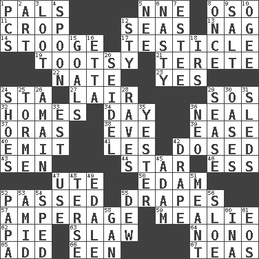 ACROSS 1. Friends 5. Compass dir. 8. Bear (Spanish) 11. Riding implement 12. Oceans 13. Tired old horse 14. Moe Howard, for one 17. A testis 19. Tootsie (variant) 21. Cigar-shaped 22. Nathan's nickname 23. It is so 24. R.R. building 27. Den 29. Distress signal 32. Dwellings 34. 24 hours 36. Actress Patricia 37. Mouths or openings 38. First lady 39. Comfort 40. Send forth 41. French article 42. Administered medicine 43. Elected rep. 44. Play the lead 46. Double-curved letter 47. Shoshoni 50. Dutch treat 52. Went by 55. Window treatments 57. Electrical Measurement 59. Ear of corn 62. Sliced dessert 63. Cole _ (cabbage dish) 64. Words to Nanette 65. Say or write further 66. Car or cant ending 67. Beverages made from leaves DOWN 1. Personal Computers (abbr.) 2. Nonscientific branch of learning 3. Spoils 4. Soup utensil 5. Born 6. Characterized by obscenity 7. First name in cosmetics 8. Single time 9. Table seasoning 10. Double curve, resembling the letter S 12. Filthy place 15. Finish lines 16. Singer James 18. Big collection agency 20. Beer mug 24. Imelda's hoard 25. Singer Mel 26. With great haste 28. All-night dance parties 29. Gospel singer Marvin 30. Fertile tracts in a desert 31. Bobsleighs 33. Eastern Standard Time (abbr.) 35. Last 36. Modern: prefix 42. Window treatment 45. First of billions? 47. Purpose 48. Laconic 49. Peak District village in England 51. Intended 52. Dad 53. Among 54. Broke a traffic law 55. Morning condensation 56. A type of plum 58. Separate the seeds from cotton 60. _ tizzy (2 wds.) 61. Greek goddess of the dawn