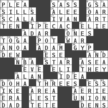 ACROSS 1. Entreaty 5. Backtalk 9. Girls' org. (abbr.) 12. Beverly of Met fame 14. Toward shelter 15. Boat paddle 16. Any of the three canals of the cochlea 17. "Terrible" tsar 18. Nonscientific branch of learning 19. Nine, plus one 20. Medicinal drug used to evoke vomiting 23. Writer Wiesel 24. The sixth month of the Jewish calendar 25. Washington bills 27. Ancient Roman robe 30. Plant holder 32. Armed conflict 33. Small Philippine buffalo 34. First of billions? 36. Hustle 38. Morning condensation 39. Compass dir. 40. Plus 43. Basketball assoc. 46. Play the lead 48. At sea 49. Night before a holiday 51. Biblical high priest 52. Those things 53. ____ Jay Lerner 54. It may be bright or harebrained 56. Capital of the state of Qatar 58. Triads 61. Curvy letter 64. Mamie's husband 65. Length times width 66. Nest on high 68. Epoch 69. For fear that 70. The state of being joined or united 71. Male parent 72. Wig 73. Lairs DOWN 1. Inconspicuous attention getter 2. Louse (plural) 3. Flair 4. 100% 5. Ketch in the Levant 6. Inventor's middle name 7. Manatee 8. Elected rep. 9. Finish lines 10. Indian skirt 11. Johnson of "Laugh-In" 13. Expressed in words 21. Dad 22. Eats (away) 23. Suggestive of the supernatural 24. American Automobile Association (abbr.) 26. Tired old horse 27. Small amount or degree 28. Single 29. Bride's dress 31. Clothes sense 35. Ear of corn 37. Romantic infatuation 41. Born 42. 24 hours 44. Actor Lugosi 45. Actress Gardner 47. Travel on an animal 48. "One Day ___ Time" 50. Main course 53. Forward in time 55. He sold his birthright 56. Passed on 57. Gumbo ingredient 59. Behest 60. Pace 61. 4th largest of the Great Lakes 62. The Jewish people; Israel 63. Elected reps. 65. Keyboard modifier key 67. Conclusion