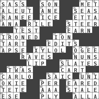 ACROSS 1. Backtalk 5. Boy, to dad 8. Was introduced to 11. Eskimo relative 13. One (Scot) 14. Oceans 15. The wife of a rajah (variant) 16. Frozen water 17. Singer James 18. Santa ___, CA 19. Cause heat under the collar 21. Bull 22. Trial 24. Merit 25. Pressed 27. Electrically charged atom 29. Small pie 30. Prepares for publication 32. Domed church section 33. Xylene (variant) 35. Double curve, resembling the letter S 39. All-night dance parties 41. Religious women 42. Mouth edge 43. Chalkboards 45. It was, poetically 48. Heavy open wagon 49. Monte _, Las Vegas Hotel/Casino 50. Ketch in the Levant 52. Single; one (prefix) 55. Migrant worker of the '30s 56. For each 57. Having ears or earlike features 59. Wig 60. American Automobile Association (abbr.) 61. Having lost freshness 62. Compass dir. 63. Travel a route regularly 64. Silent film actress Nazimova DOWN 1. "Two Mules for Sister ____" 2. Actor Alda or Thicke 3. Elected representatives 4. Institute legal proceedings 5. Travel by water 6. Single time 7. Born 8. Distance measurement 9. Consumed 10. Russian ruler of old 12. Laconic 14. Stalk of a moss capsule 20. It would 21. Posted 23. Keyboard key 25. Call ___ day 26. Hit sharply and swiftly 27. Wedding promise 28. Petroleum 30. Raised railways 31. Echolocation 33. 16 34. Slangy assent 36. From the throat 37. Compass dir. 38. Curvy letter 40. In addition 43. _-fi 44. Shoestrings 45. Receives possession of 46. Compose 47. Toward shelter 49. ____ d'Azur (French Riviera) 50. Lick closed 51. Like ___ of sunshine 53. 1994 drama film starring Jodie Foster 54. The main thing one is thinking about 56. Infant food 58. _ moment's notice (2 wds.)