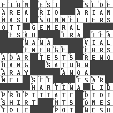 ACROSS 1. Not soft or yielding to pressure 5. Eastern Standard Time (abbr.) 8. _ gin 12. Type of rug 13. River (Sp.) 14. Believer in; advocate of (suffix) 15. Political cartoonist Thomas 16. Wine waiters 19. Baseball player Mel 20. Commissioned military rank 21. He sold his birthright 23. Lyricist Gershwin 24. Afternoon social gathering 27. Grandmother 30. Small bottle 31. Develop 34. Blunders 35. The sixth month of the Jewish calendar 38. Trials 40. Western Nevada city 41. Mild oath, euphamism for damn 42. Titan orbits this 44. Like ___ of sunshine 45. Small Philippine buffalo 46. Cartoonist voice _ Blanc 47. Arrange properly for use 50. Russian ruler of old 53. Chrissie's court nemesis 57. Flaplike covering 59. Conciliate 63. "You Light Up My Life" star Conn 64. Chest covering 65. Mountains (abbr.) 66. Washington bills 67. Lacquered or enameled metalware 68. Cooking vessel 69. Tender DOWN 1. Papal veil 2. Feeling or showing extreme anger 3. Musical pauses 4. Floor protector 5. Celtic language 6. The Jewish people; Israel 7. Heavy book 8. _ Lanka 9. Untruth 10. Rowing implement 11. Followers of ems 14. Silent film actress Nazimova 17. Medical imaging device (abbr.) 18. Ewer handle 20. Island territory of the United States 22. Disorder of the immune system 24. Hoop that covers a wheel 25. Merit 26. In addition 28. Remaining after all deductions 29. Ancient Greek god of war 30. Actresses Bloom and Felton 32. Girls' org. (abbr.) 33. Singer James 35. First of billions? 36. Have the gumption 37. Of or related to the anus 39. Player for Phoenix 43. Roll call or roster of names 47. Stricken, poetically 48. Ingest 49. Three (prefix) 51. Place in a line 52. Amusement-park features 54. Pack (down) 55. "Tell ____ the Marines!" 56. A home for chicks 58. Food container 59. Pacific Standard Time (abbr.) 60. 17th letter of the Greek alphabet 61. Petroleum 62. Before (prefix) 63. Spanish title