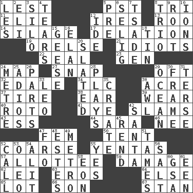ACROSS 1. For fear that 5. Pacific Standard Time (abbr.) 8. Three (prefix) 11. Writer Wiesel 12. Angers 13. Friend of Pooh 14. Fodder prepared in a silo 17. Accusation by an informer 19. Threatening words 21. Foolish or stupid persons 22. Lick closed 23. Commissioned mil. rank 24. Atlas unit 27. Fastener 29. Often (poetically) 32. Peak District village in England 34. Affectionate concern, for short 36. Land measure 37. Become fatigued 38. Hearing organ 39. Put on (as clothing) 40. Printing process, for short 41. Color 42. Criticizes harshly 43. Curvy letter 44. "Two Mules for Sister ____" 46. Born 47. Opposite of masc. 50. Portable shelter 52. Rough 55. Gossips 57. One to whom something is allotted 59. Break 62. Luau accessory 63. Greek god of love 64. Otherwise 65. Car dealer's back yard 66. Manchild 67. Comedian Laurel of Laurel & Hardy DOWN 1. French article 2. Connecticut Ivy Leaguer 3. Grain storage tower 4. Lacerates 5. Before (prefix) 6. Major League Baseball Commissioner Bud 7. Sadhe (variant) 8. Musical group of three 9. Carrot, for example 10. Charged atoms 12. Binary compound 15. Honkers 16. Liveliness 18. Metal container 20. Scheduled 24. Distance measurement (Brit.) 25. Goodbye (Sp.) 26. Pieces 28. Frolics 29. Sea 30. Movie unit 31. Laconic 33. Lion 35. Cause to be 36. Leather borer 42. Before Barbara or Clara 45. Tear apart 47. Back 48. _____ Park, CO 49. Paris' subway 51. Makes less strong or intense 52. Give a ring to 53. Butter sub 54. Came down and settled, as after flight 55. It is so 56. Table seasoning 58. Period of immesurable duration 60. Girls' org. (abbr.) 61. Car or cant ending