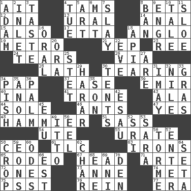 ACROSS 1. Small island 4. Scottish caps 8. Stakes 12. Heredity factor (abbr.) 13. Mountain range 14. Of or related to the anus 15. In addition 17. Singer James 18. White American of non-Hispanic descent 19. Paris' subway 21. Slangy assent 23. To riddle 24. Pulls into pieces 26. By way of 28. Thin strip of wood or metal 30. Lacerating 34. Infant food 37. Comfort 39. Independent ruler or chieftain 40. _ tizzy (2 wds.) 41. Heavy duty weighing machine 43. Insect wing 44. Not divided or shared with others 46. Pismires 47. Affirmative reply 48. More overdramatic by comparison 51. Backtalk 54. Shoshoni 55. A salt of uric acid 58. Corporate head (abbr.) 61. Affectionate concern, for short 63. Removes the wrinkles 65. Cowboy competition 67. Froth on beer 71. Johnson of "Laugh-In" 72. Washington bills 73. Singer Murray 74. Was introduced to 75. Inconspicuous attention getter 76. It's straight from the horse's mouth 77. Epoch DOWN 1. First of billions? 2. An arm off of a larger body of water 3. Clothes sense 4. Third day of the wk. 5. Nonscientific branch of learning 6. Floor protector 7. Kill 8. Bar 9. Engineer (abbr.) 10. Story 11. _ gin 16. Relating to the mouth 18. Capital of Western Samoa 20. Mouth or opening 22. Night before a holiday 25. Proofreading order 27. "We ___ not amused" (Victoria) 29. Ethiopian city, capital of Harari 30. Portable shelters 31. "If ____ say so..." 32. Mediterranean tributary 33. Pate de foie ____ 34. Expression of disdain 35. Small Philippine buffalo 36. Inside of hand 38. Manchild 42. He sold his birthright 45. Australian flightless bird 49. "Tell ____ the Marines!" 50. Snakelike fish 52. Indian title of respect (Mr.) 53. "Two Mules for Sister ____" 56. Singer Mel 57. Keyboard key 58. Riding implement 59. Immeasurably long periods of time 60. Lyric poems 62. Burn to charcoal 64. Stalk of a moss capsule 66. Eastern Standard Time (abbr.) 68. Compass dir. 69. Black tropical American cuckoo 70. Lair