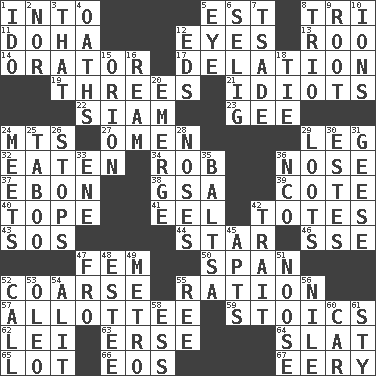 ACROSS 1. To the inside or interior of 5. Eastern Standard Time (abbr.) 8. Three (prefix) 11. Capital of the state of Qatar 12. Sight organs 13. Friend of Pooh 14. Speaker 17. Conveyance 19. Trios 21. Foolish or stupid persons 22. Thailand, formerly 23. Turn to the right 24. Mountains (abbr.) 27. Sign of things to come 29. Part of a journey 32. Consumed 34. Director Reiner 36. Olfactory organ 37. Inky black, to poets 38. Girls' org. (abbr.) 39. ____ d'Azur (French Riviera) 40. Drink excessively 41. Snakelike fish 42. Hauls 43. Distress signal 44. Play the lead 46. Compass dir. 47. Opposite of masc. 50. Connect, as a bridge 52. Unrefined 55. Food allowance for one day 57. One to whom something is allotted 59. Unemotional ones 62. Luau accessory 63. Celtic language 64. Narrow board 65. Car dealer's back yard 66. Greek goddess of the dawn 67. Suggestive of the supernatural DOWN 1. Wedding promise 2. Not either 3. Not this but _ 4. Profane or obscene expressions 5. Sight organ 6. Major League Baseball Commissioner Bud 7. Sadhe (variant) 8. Musical group of three 9. Carrot, for example 10. Charged particles 12. Begley and Asner 15. Greek mythologigal hunter 16. 480, 500 or 516 sheets of paper 18. Standoff 20. Develop 24. Confronts 25. Off limits 26. Ceases 28. Olfactory organs 29. Plunders 30. _____ Park, CO 31. Honkers 33. Compass dir. 35. Greek mezzo-soprano Agnes 36. Non-commissioned officer (abbr.) 42. Distinguishing feature 45. Flats, for short 47. Away 48. First name in cosmetics 49. Paris' subway 51. Trap for birds or small mammals 52. Give a ring to 53. Margarine 54. Came down and settled, as after flight 55. To sift 56. The longest river in the world 58. Curvy letter 60. 4-wheeled motor vehicle 61. Filthy place