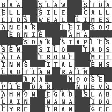 ACROSS 1. Sound made by sheep 4. Cole _ (cabbage dish) 8. Portico 12. Pipe bend 13. Filth; sediment 14. Give a ring to 15. Flaplike coverings 17. Welt 18. Citrus fruits 19. Approach 21. Flowery wreath 23. "Barney Miller" actor Jack 24. Bert's buddy 26. Wet nurse (var.) 28. Neighbor of Neb. 30. Paper fasteners 34. Elected rep. 37. Grain storage tower 39. Bits 40. "One Day ___ Time" 41. Marketplace scale 43. Was introduced to 44. Lodging establishments 46. Slanted text style (abbr.) 47. Followers of ems 48. Of or relating to Laos or its people 51. Precipitation 54. Alias (abbr.) 55. Trap for birds or small mammals 58. Sliced dessert 61. Boat paddle 63. New (sp.) 65. ID or VA city 67. Mild oath 71. Broad, flat, thick piece 72. (Had) reclined 73. Grandmother 74. Wedding promise 75. Jane of fiction 76. SW Asia republic 77. Unit of force equal to gravity DOWN 1. Actor Lugosi 2. Place in a line 3. Tree or shrub in the Birch family 4. Compass dir. 5. Falsehood 6. In the manner of 7. Not ill 8. _-fi 9. Scottish caps 10. Margarine 11. In addition 16. Without 18. Pale green bean 20. To free from 22. Ingest 25. 90 degrees 27. Fitting 29. Japanese brewing company 30. Echolocation 31. Unable to walk 32. Paradise 33. Fast planes 34. Move on water 35. Inactive volcano in Sicily 36. Billionth: prefix 38. Car dealer's back yard 42. Enthusiasm 45. R.R. building 49. Picture 50. Auto club (abbr.) 52. Electrically charged atom 53. Horse sense 56. Major League Baseball Commissioner Bud 57. Elude 58. Diluted with white 59. "If ____ say so..." 60. Independent ruler or chieftain 62. Painter Guido (1575-1642) 64. Mitch Miller's instrument 66. Single 68. Slender fish 69. Santa ___, CA 70. One of the 12 tribes of Israel