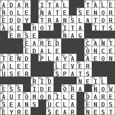 ACROSS 1. The sixth month of the Jewish calendar 5. Slanted text style (abbr.) 9. Story 13. Hero or heavy, e.g. 14. Nathan's nickname 15. Sir (Sp.) 16. Whirlpool 17. Interpreter 19. Grow older 20. Being at a high temperature 21. Call ___ day 22. It is 23. Celtic language 25. Tired old horse 26. Having ears or earlike features 30. Patter 34. Peak District village in England 35. Single time 36. Watch over 39. Beach, in Buenos Aires 42. A really long time 43. Toward shelter 44. Crowbar 46. One who makes use of a thing 47. Arguments over trivial matters 48. To free from 51. Famous astronaut Armstrong 54. Curvy letter 57. Binary compound 58. Mouth or opening 60. At this time 62. Car 65. Have the gumption 66. Seines 67. Southern CA. univ. 68. Extremities 69. Jane of fiction 70. Wither 71. Egg locale DOWN 1. Length times width 2. Evade 3. Tree or shrub in the Birch family 4. Marina Del _, California 5. To the inside or interior of 6. Small pie 7. _ moment's notice (2 wds.) 8. Soviet premier 1918-24 9. Afternoon social gathering 10. Against 11. Spoils 12. Blunders 15. Volcanic refuse 18. R.R. building 20. Froth on beer 24. Sowing specialist 27. Strike 28. Pipe bend 29. Allots cards 30. Unrefined 31. A saturated hydrocarbon 32. Non-commissioned officer (abbr.) 33. "___ Little Indians" 36. The 19th letter of the Greek alphabet 37. Raised railways 38. Born 40. Slangy assent 41. Actress Gardner 45. Inactive volcano in Sicily 48. Basketball hoops 49. Wedding promise 50. Alight from a bus 52. Silly 53. Nobles 54. Relaxation 55. Chop _ 56. Play the lead 58. Rounded earthenware pot or jar 59. Tail end 61. 270 degrees 63. Single 64. Frozen water 65. Lair