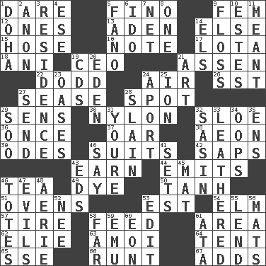ACROSS 1. Have the gumption 5. Fine (Spanish) 9. Opposite of masc. 12. Singles 13. An important port of Yemen 14. Otherwise 15. Flexible conduit 16. Observe 17. Globular water bottle used in Asia 18. Black tropical American cuckoo 19. Corporate head (abbr.) 21. NE Netherlands city 22. Texas town _ City 24. Atmosphere 26. Fast jet (abbr.) 27. Gospel singer Marvin 28. Specific locale 29. Elected reps. 30. Thermoplastic polyamide 32. A type of plum 36. Single time 37. Rowing implement 38. Period of immesurable duration 39. Lyric poems 40. Sets of matching outer garments 42. Plant excrements 43. Merit 44. Sends forth 46. Afternoon social gathering 49. Color 50. Hyperbolic tangent 51. Baking chambers 53. Eastern Standard Time (abbr.) 54. Shade tree 57. Become fatigued 58. Nourish 61. Length times width 62. Writer Wiesel 63. Mine, in Marseilles 64. Portable shelter 65. Compass dir. 66. The smallest animal of a litter 67. Sums up DOWN 1. Capital of the state of Qatar 2. Soon (poet.) 3. Home 4. Compass dir. 5. Papal veil 6. Wedding promise 7. Remaining after all deductions 8. Single 9. Soft thread for cleaning between teeth 10. _____ Park, CO 11. Intended 14. Raised railways 19. Music discs 20. Locale of original sin 21. Tate display 23. Fertile tracts in a desert 24. To the left, to Queeg 25. Electrically charged atom 27. Transmit 28. Killed 29. "Barney Miller" actor Jack 31. You are 32. Indian antelope 33. Tough but pliablecoriaceous 34. I made a mistake 35. Followers of ems 40. Declare 41. Arranges properly for use 43. Begley and Asner 45. Floor protector 46. Lugs 47. Vices 48. Nest on high 52. Born 53. Prepare for publication 55. Grant temporary use of 56. Floor protectors 58. Distant 59. Australian flightless bird 60. A really long time 61. "One Day ___ Time"