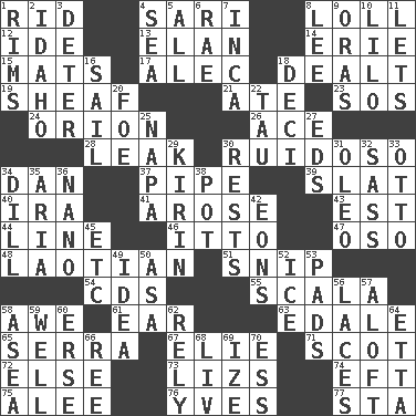 ACROSS 1. To free from 4. Indian skirt 8. Hang loosely or laxly 12. Binary compound 13. Flair 14. One of the Great Lakes 15. Floor protectors 17. Actor Baldwin 18. Started a card game 19. To gather and bind into a bundle 21. Had dinner 23. Mayday 24. Greek mythologigal hunter 26. Adept person 28. Path through which fluid escapes 30. Noisy, rowdy, vocal (Spanish) 34. Daniel's nick name 37. Corncob 39. Narrow board 40. Retirement account (abbr.) 41. Came up 43. Eastern Standard Time (abbr.) 44. Actor's bit 46. "Tell ____ the Marines!" 47. Bear (Spanish) 48. Of or relating to Laos or its people 51. Clip 54. Music discs 55. Any of the three canals of the cochlea 58. Deep reverence 61. Ewer handle 63. Peak District village in England 65. Father Junipero _ 67. Writer Wiesel 71. Native of Scotland 72. Otherwise 73. Belonging to Elizabeth 74. Lizard (obsolete) 75. Toward shelter 76. Jacques Cousteau's middle name 77. R.R. building DOWN 1. Basketball hoops 2. Potato state 3. Prevent from occurring 4. Ocean 5. Everything 6. Actress Charlotte 7. South American Indian 8. Area sheltered from the wind 9. Mouths or openings 10. _ and Stitch 11. Allows 16. Travel by water 18. Tenth: prefix 20. Enemy 22. The 19th letter of the Greek alphabet 25. California wine valley 27. Begley and Asner 29. Japanese brewing company 30. Musical pauses 31. Margarine 32. Backtalk 33. "Beetle Bailey" pooch 34. Deli pickle 35. Roberta Peters solo 36. Billionth: prefix 38. Plant holder 42. Immeasurably long periods of time 45. And so on (abbr.) 49. The main thing one is thinking about 50. White ___ sheet 52. Frozen water 53. Groovy apts. 56. Shoestrings 57. Upward 58. Toward the sea 59. Water source 60. Celtic language 62. Have confidence or faith in 64. Singer James 66. To separate or throw off 68. 54 in ancient Rome 69. Ending with capital 70. Double-curved letter
