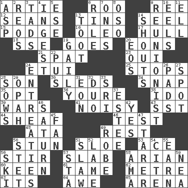 ACROSS 1. Nick name for Arthur 6. Friend of Pooh 9. Portuguese money of account (variant) 12. Actors Connery and Penn 13. Canisters 14. Sew up the eyelids of hawks and falcons 15. Plash 16. Margarine 17. Frame or body of a ship 18. Compass dir. 19. Moves 20. Immeasurably long periods of time 21. Petty quarrel 23. Fr. "Yes" 24. Needle holder 25. Halts 28. Male offspring 30. Bobsleighs 34. Fastener 35. Choose 36. You are 38. Wedding promise 39. Armed conflicts 41. Annoyingly loud 43. Fast jet (abbr.) 44. Bundle of cut stalks of grain 46. Trial 48. "One Day ___ Time" 49. Remainder 50. Astound 51. A type of plum 53. Adept person 56. Tumult 57. Thick slice 58. Believer in; advocate of (suffix) 60. Peachy ____! 61. Docile 62. Distance measurement (Brit.) 63. It is 64. Deep reverence 65. Sports stadium DOWN 1. Viper 2. Vintage cars 3. Bits 4. Consume 5. Compass dir. 6. Cause heat under the collar 7. Singles 8. Bear (Spanish) 9. One who advocates reunion 10. Snakelike fish 11. Pipe bend 13. A blast of a horn 14. Yells 19. Lightheartedly 20. Greek goddess of the dawn 22. Product of festering 24. Pleas 26. Writing tablets 27. Blemish 28. Sty mamas 29. Brightly colored fish 31. Period of immesurable duration 32. Superhero pair 33. _ Lanka 37. First name in cosmetics 40. Titan orbits this 42. Consenting reply 45. Air blower 47. A viewer who gazes fixedly 49. Loose flowing garment 50. Proofreading order 51. Cole _ (cabbage dish) 52. Unable to walk 54. Quote 55. Merit 56. What Jean-Claude Killy likes to do 57. R.R. building 58. Wet nurse (var.) 59. Teachers' org.