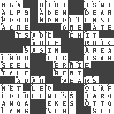 ACROSS 1. Basketball assoc. 4. "You Light Up My Life" star Conn 8. Is not 12. High mountains 14. Arabian gulf 15. Letter starter 16. "Silly old bear" 17. Unrelated to defense, as in spending 20. 1/640 square mile 21. Single 22. Had dinner 23. Sadhe (variant) 27. Send forth 29. Short-tailed, large-bodied rat 31. College mil. group 34. Indian antelope 35. Length times width 36. Inside; within (prefix) 39. And so on (abbr.) 41. Russian ruler of old 42. Stitch closed the eyes of (a falcon) 43. Bert's buddy 46. Story 47. Monthly bill 48. The sixth month of the Jewish calendar 51. Erodes 54. Fish or hair follower 56. Lion 58. Norwegian king 61. The property of being fit to eat 66. Edible starchy tuberous root 67. Small Philippine buffalo 68. Makes supply last 69. Von Bismarck 70. Austrian-born American filmmaker Fritz 71. Posted 72. Arrange properly for use DOWN 1. California wine valley 2. Coalition 3. To the left, to Queeg 4. One of the 12 tribes of Israel 5. Wedding promise 6. Lair 7. Southeast Asian peninsula 8. Binary compound 9. Elected representatives 10. Political cartoonist Thomas 11. Woody plant 13. "______ My Girl" (Turtles hit) 18. Compass dir. 19. Opposite of masc. 24. Actress Gardner 25. Two (Sp.) 26. Writer Wiesel 28. Feeling or showing extreme anger 30. Keyboard key 32. Beverage made from leaves 33. 4-wheeled motor vehicle 34. Having a sole or soles 36. Eastern Standard Time (abbr.) 37. Teachers' org. 38. Conveyance 40. Ship's personnel 44. Compass dir. 45. Call ___ day 49. 100% 50. To riddle 52. Printing process, for short 53. Narrow boards 54. Actress Patricia 55. Pulitzer Prize-winning author Ferber 57. Washington bills 59. Johnson of "Laugh-In" 60. Pick up the tab 62. Paper or plastic container 63. Supplement with great effort 64. Elected rep. 65. Fast jet (abbr.)