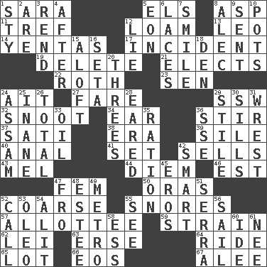 ACROSS 1. "Two Mules for Sister ____" 5. Raised railways 8. Cleo's killer 11. Not kosher 12. Rich soil 13. Lion 14. Gossips 17. Happening 19. Keyboard key 21. Chooses 22. Writer of Portnoy's Complaint (1969) 23. Elected rep. 24. Small island 27. Conductor's collection 29. Compass dir. 32. Snob 34. Hearing organ 36. Tumult 37. Suttee (variant) 38. Epoch 39. Drop; flow; fall 40. Of or related to the anus 41. Arrange properly for use 42. Makes a sale 43. Cartoonist voice _ Blanc 44. South Vietnam president (1954) 46. Eastern Standard Time (abbr.) 47. Opposite of masc. 50. Mouths or openings 52. Unrefined 55. Sounds asleep 57. One to whom something is allotted 59. Put through a sieve 62. Flowery wreath 63. Celtic language 64. Travel on an animal 65. Car dealer's back yard 66. Greek goddess of the dawn 67. Toward shelter DOWN 1. Filthy place 2. "We ___ not amused" (Victoria) 3. Tear apart 4. Following 5. A really long time 6. Shoestrings 7. Grin 8. Actor Baldwin 9. Transmitted 10. Cooking vessels 12. Falsehood 15. At or to great height 16. Bristle 18. Lair 20. Triplets 24. Indian state 25. Empty; void 26. "_____ Recall" 28. Having ears or earlike features 29. Vertical member of a panel or frame 30. Beverly of Met fame 31. Obtain by seizing forcibly or violently 33. Petroleum 35. Food allowance for one day 36. Compass dir. 42. Don Adams' spy role 45. Greek god of love 47. Back 48. First name in cosmetics 49. Paris' subway 51. Father Junipero _ 52. Give a ring to 53. Margarine 54. Set down 55. Observe 56. Travel by water 58. Curvy letter 60. Binary compound 61. Born