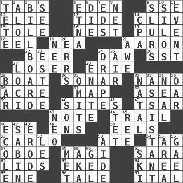 ACROSS 1. Bar bills 5. Paradise 9. Compass dir. 12. Writer Wiesel 13. Periodic rise and fall of the sea level 14. 154 in Roman numerals 15. Lacquered or enameled metalware 16. A home for chicks 17. Whine 18. Snakelike fish 19. Teachers' org. 21. Composer Copland 22. Fermented drink made from hops 24. Obsolete 26. Fast jet (abbr.) 27. Failure 28. 4th largest of the Great Lakes 29. Water vessel 30. Underwater navigation system 32. Billionth: prefix 36. Measure of real estate 37. Atlas unit 38. At sea 39. Travel on an animal 40. Locates 42. Russian ruler of old 43. Brief written record 44. Get behind 46. Compass dir. 49. Followers of ems 50. Snakelike fish 51. Monte _, Las Vegas Hotel/Casino 53. Had dinner 54. Label 57. Mitch Miller's instrument 58. Wise men 61. "Two Mules for Sister ____" 62. Hats (slang) 63. Made supply last 64. Leg joint 65. Compass dir. 66. Lie 67. Slanted text style (abbr.) DOWN 1. Wig 2. Medicinal plant 3. Big road sign 4. Perceive with the eye 5. Inactive volcano in Sicily 6. Pass on 7. Begley and Asner 8. Remaining after all deductions 9. Plays smoothly or legato 10. Grain storage towers 11. Happening 14. Numbers guy (abbr.) 19. Born 20. Blunders 21. Deep reverence 23. First name in cosmetics 24. Window treatment 25. Atmosphere 27. Event scenes 28. Maternal 29. Tavern 31. Leaves out 32. Relating to or accompanying birth 33. Aide 34. Actress Patricia 35. Boat paddle 40. Boy, to dad 41. Proofreading order 43. Modern: prefix 45. To sift 46. Learning spot: Fr. 47. Unit of acoustic absorption 48. Wear away 52. French article 53. Helper 55. Length times width 56. Highlander 58. Was introduced to 59. Alias (abbr.) 60. Set 61. What Jean-Claude Killy likes to do