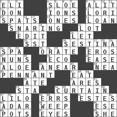 ACROSS 1. Biblical high priest 4. _ gin 8. Came down and settled, as after flight 12. Spanish title 13. Charged atoms 14. Australian parrot (variant) 15. Arguments over trivial matters 18. Singles 19. Grant temporary use of 20. Catching in a trap 22. Car dealer's back yard 23. Prepare for publication 24. Allow 25. Fast jet (abbr.) 26. French poetic form 30. Health resort 33. Speak pompously 36. Greek god of love 37. Religious women 39. Environmental prefix 40. Comfort 41. Medicinal plant 42. Approach 44. Teachers' org. 45. Pre-World Series prize 47. Consume 50. Had dinner 51. Ancient Greek god of war 53. R.R. building 54. Window treatment 57. _ and Stitch 59. Blunders 61. _____ Park, CO 63. The sixth month of the Jewish calendar 64. Shed a tear 65. Compass dir. 66. Cooking vessels 67. Sight organs 68. A female animal or person DOWN 1. Begley and Asner 2. Chops off 3. Lacking in sense or substance 4. The Jewish people; Israel 5. Having great length 6. Single 7. Curvy letter 8. One to whom something is allotted 9. Spoils 10. Retirement account (abbr.) 11. Shallow baking pan 16. Small boys 17. Indian titles of respect 21. "Tell ____ the Marines!" 22. French article 24. Area sheltered from the wind 26. Portico 27. SW Asia republic 28. Characteristic smell of wine 29. At sea 30. Fastener 31. Whine 32. Soon (poet.) 34. Monthly bill 35. Adept person 38. Legislators 42. A saturated hydrocarbon 43. Bring up, as a child 46. _ moment's notice (2 wds.) 48. Johnson of "Laugh-In" 49. Afternoon social gatherings 52. Settings 53. Narrow board 54. Algonquian 55. United States Postal Service (abbr.) 56. Soft 57. Infant locale 58. Wedding promise 59. She-sheep 60. Marina Del _, California 62. Observe