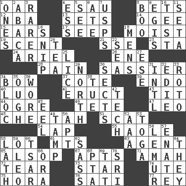 ACROSS 1. Boat paddle 4. He sold his birthright 8. Wagers 12. Basketball assoc. 13. Arranges properly for use 14. Double curve, resembling the letter S 15. Hearing organs 17. Ooze 18. Damp 19. Odor 21. Compass dir. 23. R.R. building 24. Satellite of Uranus 26. Compass dir. 28. Ache 30. More lively and spirited 34. Arrow shooter 37. ____ d'Azur (French Riviera) 39. Inside; within (prefix) 40. Nilotic language 41. Spew [out] 43. Teat (slang) 44. Legendary monster 46. Wig 47. Lion 48. Leopard's kin 51. Go away! 54. Pet locale 55. White Person, in Hawaii 58. Car dealer's back yard 61. Mountains (abbr.) 63. Rep 65. Columnist Joseph or Stewart 67. Tenement units (abbr.) 71. Housemaid 72. Separate forcefully 73. Play the lead 74. Shoshoni 75. Israeli folk dance 76. Suttee (variant) 77. Marina Del _, California DOWN 1. Washington bills 2. Phillipine bananalike plant 3. More valued for its uncommonness 4. Double-curved letter 5. Observe 6. Had dinner 7. United States Postal Service (abbr.) 8. Oct. 31 cry 9. Armor plate that protects the chest 10. Trial 11. Stalk of a moss capsule 16. Clip 18. Not women's 20. Beverage made from leaves 22. Ocean 25. Louse (plural) 27. Compass dir. 29. Compass direction 30. Religious groups 31. International (abbr.) 32. Singer Brickell 33. Printing process, for short 34. Alliance 35. Ending for "Through" and "Enough" 36. Had on 38. Third day of the wk. 42. Technician 45. Snakelike fish 49. Pack (down) 50. Fitting 52. American Automobile Association (abbr.) 53. Ancient Roman robe 56. Arboreal primate 57. Maternal 58. Thin strip of wood or metal 59. Butter sub 60. Russian ruler of old 62. Backtalk 64. Those people 66. Mouth or opening 68. Parent Teacher Assoc. 69. Make lace 70. Indian title of respect (Mr.)