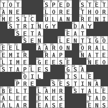 ACROSS 1. Small child 4. Hurried 8. Proofreading order 12. One (Scot) 13. Old wives' tales, e.g. 14. Son of Odin 15. Of or pertaining to a meson 18. Uhlan (variant) 19. Painter Guido (1575-1642) 20. Slender, wiry 22. 24 hours 23. Bristle 24. Ingest 25. Elected rep. 26. Small, flat, pigmented spot on the skin 30. Snakelike fish 33. Composer Copland 36. Of the mouth 37. Independent ruler or chieftain 39. Strike 40. Nathan's nickname 41. Citrus frut 42. Honkers 44. Modern: prefix 45. Paper fasteners 47. Girls' org. (abbr.) 50. Petroleum 51. Small island 53. Before (prefix) 54. French poetic form 57. Waist strap 59. Cowardly lion portrayer 61. Lacking originality or spontaneity 63. Toward shelter 64. Supplements with great effort 65. Small amount or degree 66. Having or resembling wings 67. Comfort 68. Followers of ems DOWN 1. Scottish cap 2. Singles 3. Trials 4. Strike heavily 5. More than one (prefix) 6. Period 7. Lair 8. Ski resort town in Vermont 9. Those things 10. Period of immesurable duration 11. Three (prefix) 16. Angers 17. Quote 21. Grandmother 22. One of the 12 tribes of Israel 24. Car or cant ending 26. Chops off 27. SW Asia republic 28. Yard entry 29. Butter sub 30. Snakelike fish 31. Send forth 32. Pale green bean 34. Ancient Greek god of war 35. Actress Charlotte 38. News announcer 42. Set 43. Armor plate that protects the chest 46. Whopper 48. Fast planes 49. Came down and settled, as after flight 52. Maternal 53. Entreaty 54. "______ My Girl" (Turtles hit) 55. Celtic language 56. Actor Alda or Thicke 57. Sound made by sheep 58. Pipe bend 59. Area sheltered from the wind 60. Alias (abbr.) 62. Begley and Asner