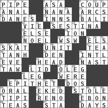 ACROSS 1. Corncob 5. White ___ sheet 8. Overturn; upset 12. Of or related to the anus 13. Grandmother 15. Curves 16. Natives or inhabitants of Denmark 18. Restaurants 19. Indonesian resort city 20. Compete 22. French poetic form 24. Otherwise 26. Electrically charged atom 27. Christmas carol 28. Compass dir. 29. Raised railways 32. Three-handed card game 35. A single undivided whole 37. Afternoon social gathering 38. Hyperbolic tangent 39. Lair 40. International (abbr.) 41. First lady 42. Froth on beer 43. Political cartoonist Thomas 44. The 23rd letter of the Hebrew alphabet 45. Hat (slang) 46. Cassini of fashion 49. Part of a journey 50. We are 51. Curse 55. Two (Sp.) 56. Spoken 57. Made supply last 59. Fur scarf 63. Native american tent (variation) 64. Western Nevada city 65. Inky black, to poets 66. Beverages made from leaves 67. R.R. building 68. 24-hour periods DOWN 1. Writing tablet 2. _ tizzy (2 wds.) 3. Baking dish 4. Veterans Day date 5. Cuckoo 6. Without 7. Queen of England 1702-14 8. Small house or cottage 9. NW Algerian seaport 10. Southern CA. univ. 11. 23rd letter of the Greek alphabet 14. Help 17. Grain storage tower 21. Compass dir. 23. Pull behind 25. Evaded 28. Light entry point 29. Inactive volcano in Sicily 30. Allows 31. Table seasoning 32. Proofreading order 33. Polynesian shrub of the pepper family 34. Afresh 36. Teachers' org. 40. Consumed 42. Having greater elevation 45. Allow 47. Directed 48. Greek god of love 49. Ms. Damita and namesakes 51. One of the Great Lakes 52. Dad 53. Supplements with great effort 54. Portable shelter 56. Baseball player Mel 58. ___ good deed 60. Chief or king in Benin or Nigeria 61. Myrna of the movies 62. Followers of ems