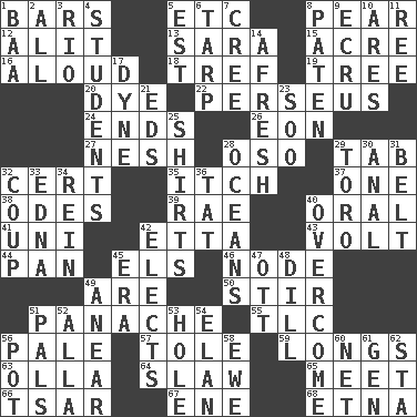 ACROSS 1. Long, evenly shaped pieces 5. And so on (abbr.) 8. Lightbulb-shaped fruit 12. Set down 13. "Two Mules for Sister ____" 15. 43,560 square feet 16. Verbally 18. Unclean, religiously 19. Relationship diagram 20. Color 22. Son of Zeus who helped slay Medusa 24. Extremities 26. Period of immesurable duration 27. Soft 28. Bear (Spanish) 29. Bar bill 32. Certainty 35. Hankering 37. Single 38. Lyric poems 39. Actress Charlotte 40. Spoken 41. University (slang) 42. Singer James 43. Electrical Unit 44. Baking dish 45. Raised railways 46. Thickened enlargement 49. "We ___ not amused" (Victoria) 50. Commotion 51. Flamboyance 55. Affectionate concern, for short 56. Light colored 57. Lacquered or enameled metalware 59. Yearns 63. Water jar 64. Cole _ (cabbage dish) 65. Rendezvous 66. Russian ruler of old 67. Compass dir. 68. Inactive volcano in Sicily DOWN 1. Sound made by sheep 2. Everything 3. _ de Janeiro 4. SAT takers 5. Eastern Standard Time (abbr.) 6. Canvas cover 7. Algonquian 8. Eucharist need 9. Shade of tan 10. Ancient Greek god of war 11. To sift 14. Anew 17. Centimeter-gram-second unit of force 21. Begley and Asner 23. "Barney Miller" actor Jack 25. Chest coverings 28. Seas 29. "Corrida" creature 30. Of or related to the anus 31. Waist strap 32. Overturn; upset 33. Pulitzer Prize-winning author Ferber 34. It's straight from the horse's mouth 36. Make lace 40. Conquer 42. Chooses 45. Period 47. Baseball player Mel 48. Deli pickle 49. Approach 51. Friends 52. Silent film actress Nazimova 53. Opening into or through something 54. Style 56. Plant holder 58. She-sheep 60. Remaining after all deductions 61. Commissioned mil. rank 62. R.R. building