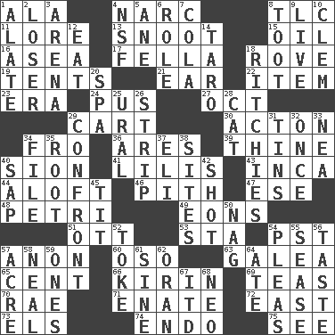 ACROSS 1. Chicken ___ king 4. Drug cop 8. Affectionate concern, for short 11. Old wives' tales, e.g. 13. Snob 15. Lubricate 16. At sea 17. Chap (slang) 18. Be footloose 19. Portable shelters 21. Hearing organ 22. A distinct part 23. Epoch 24. Product of festering 27. Sep. follower 29. Draw slowly or heavily 30. NE Massachussets city 34. Away 36. Ancient Greek god of war 39. One or ones belonging to thee 40. The Jewish people; Israel 41. Ms. Damita and namesakes 43. South American Indian 44. At or to great height 46. Heart or essence 47. Compass dir. 48. _ dish (used to culture cells) 49. Immeasurably long periods of time 51. Baseball player Mel 53. R.R. building 54. Pacific Standard Time (abbr.) 57. Soon (poet.) 60. Bear (Spanish) 63. An organ shaped like a helmet 65. Penny 66. Japanese brewing company 69. Afternoon social gatherings 70. Actress Charlotte 71. Related on the mother's side 72. 90 degrees 73. Raised railways 74. Inside; within (prefix) 75. Perceive with the eye DOWN 1. Having winglike extensions 2. Failure 3. Sports stadium 4. Overdraft (abbr.) 5. A saturated hydrocarbon 6. Hero or heavy, e.g. 7. Root beer relative 8. A blast of a horn 9. Moving, as bait 10. Clement's nick name 12. Consume 14. Pacific island yam 18. Actors Guy, Robert Welles, and Clint 20. Health resort 25. Mountain range 26. Long narrow piece of something 28. Feline 29. Meet 31. Canisters 32. At one time in the past 33. Teachers' org. 34. Do some clerical work 35. Carrot, for example 37. Connecticut Ivy Leaguer 38. Settings 40. Plant excrement 42. Guess 45. Teat (slang) 50. Tired old horse 52. Puff or smoke 54. Entreaties 55. Gospel singer Marvin 56. Clothes sense 57. 43,560 square feet 58. Anneal 59. Washington bills 61. Trig term 62. NW Algerian seaport 64. Had dinner 67. It would 68. Modern: prefix