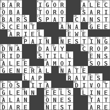 ACROSS 1. Tavern 4. Russian composer Stravinsky 8. Actor Baldwin 12. Chief or king in Benin or Nigeria 13. "Corrida" creature 14. Indian skirt 15. Taverns 17. Petty quarrel 18. 2nd pers. sing. pres. of can (arch.) 19. Odor 21. Santa ___, CA 23. Unit of force equal to gravity 24. Satellite of Uranus 26. She-sheep 28. Ache 30. Inhabiting a nest 34. Heredity factor (abbr.) 37. _ Jones' Locker 39. Riding implement 40. To free from 41. Not moving 43. Followers of ems 44. Toward shelter 46. Mine, in Marseilles 47. Distress signal 48. Commissioned military rank 51. Nathan's nickname 54. Pet locale 55. All-night dance parties 58. Greek goddess of the dawn 61. Call ___ day 63. A piece of turf (Scot.) 65. American astronaut and politician John 67. Snakelike fish 71. Actor's bit 72. Actor Alda or Thicke 73. Singles 74. Make lace 75. Have the gumption 76. A home for chicks 77. "We ___ not amused" (Victoria) DOWN 1. Moves up and down 2. Phillipine bananalike plant 3. Less widely known 4. ___ a Wonderful Life 5. Republican Party 6. Mouth or opening 7. Roll call or roster of names 8. White ___ sheet 9. Austrian-born American filmmaker Fritz 10. Celtic language 11. Quote 16. Sever or remove by pinching or nipping 18. Crow sounds 20. Beverage made from leaves 22. Born 25. Flaplike coverings 27. And so on (abbr.) 29. Relating to or accompanying birth 30. High-strength synthetic material 31. Angers 32. Words to Nanette 33. Global Positioning Systems (abbr.) 34. To draw with force 35. The longest river in the world 36. Arabian gulf 38. Zeal 42. One who doesn't tell the truth 45. Snakelike fish 49. Water falling in drops from the sky 50. Fitting 52. Bit 53. Morally bad or wrong 56. Webber/Rice musical 57. Underwater navigation system 58. Mild oath 59. Rounded earthenware pot or jar 60. Dry up 62. A really long time 64. Wig 66. Compass dir. 68. Compass dir. 69. French article 70. Fast jet (abbr.)