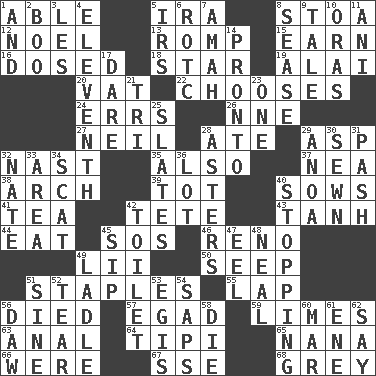 ACROSS 1. Competent 5. Lyricist Gershwin 8. Portico 12. Christmas carol 13. Play 15. Merit 16. Administered medicine 18. Play the lead 19. Jai _ 20. Large container 22. Elects 24. Blunders 26. Compass dir. 27. Famous astronaut Armstrong 28. Had dinner 29. Cleo's killer 32. Political cartoonist Thomas 35. In addition 37. Teachers' org. 38. Bowlike part 39. Small child 40. Sty mamas 41. Afternoon social gathering 42. Wig 43. Hyperbolic tangent 44. Ingest 45. Distress signal 46. Former U.S. Attorney General Janet 49. Cards in a Roman deck? 50. Ooze 51. Paper fasteners 55. Pet locale 56. Passed on 57. Mild oath 59. Citrus fruits 63. Of or related to the anus 64. Native american tent (variation) 65. Nanny 66. Past tense of be (plural) 67. Compass dir. 68. Jennifer or Joel DOWN 1. Also 2. Oct. 31 cry 3. French article 4. Veterans Day date 5. Big collection agency 6. College mil. group 7. Housemaid 8. Gospel singer Marvin 9. Lie 10. Mouths or openings 11. Cuckoo 14. Right away 17. Have the gumption 21. Three (prefix) 23. Single 25. Chalkboards 28. Michaelmas daisies 29. Small Philippine buffalo 30. Stitched 31. Romantic infatuation 32. Nathan's nickname 33. Length times width 34. Go away! 36. Car dealer's back yard 40. Constricting 42. Bathroom plumbing fixture 45. Small drink 47. Snakelike fish 48. Anneal 49. Dipping utensil 51. Trig term 52. Pull into pieces 53. The front part of a cuirass 54. Plant excrements 56. Obsolete 58. Pass on 60. Impair 61. Compass dir. 62. Declare
